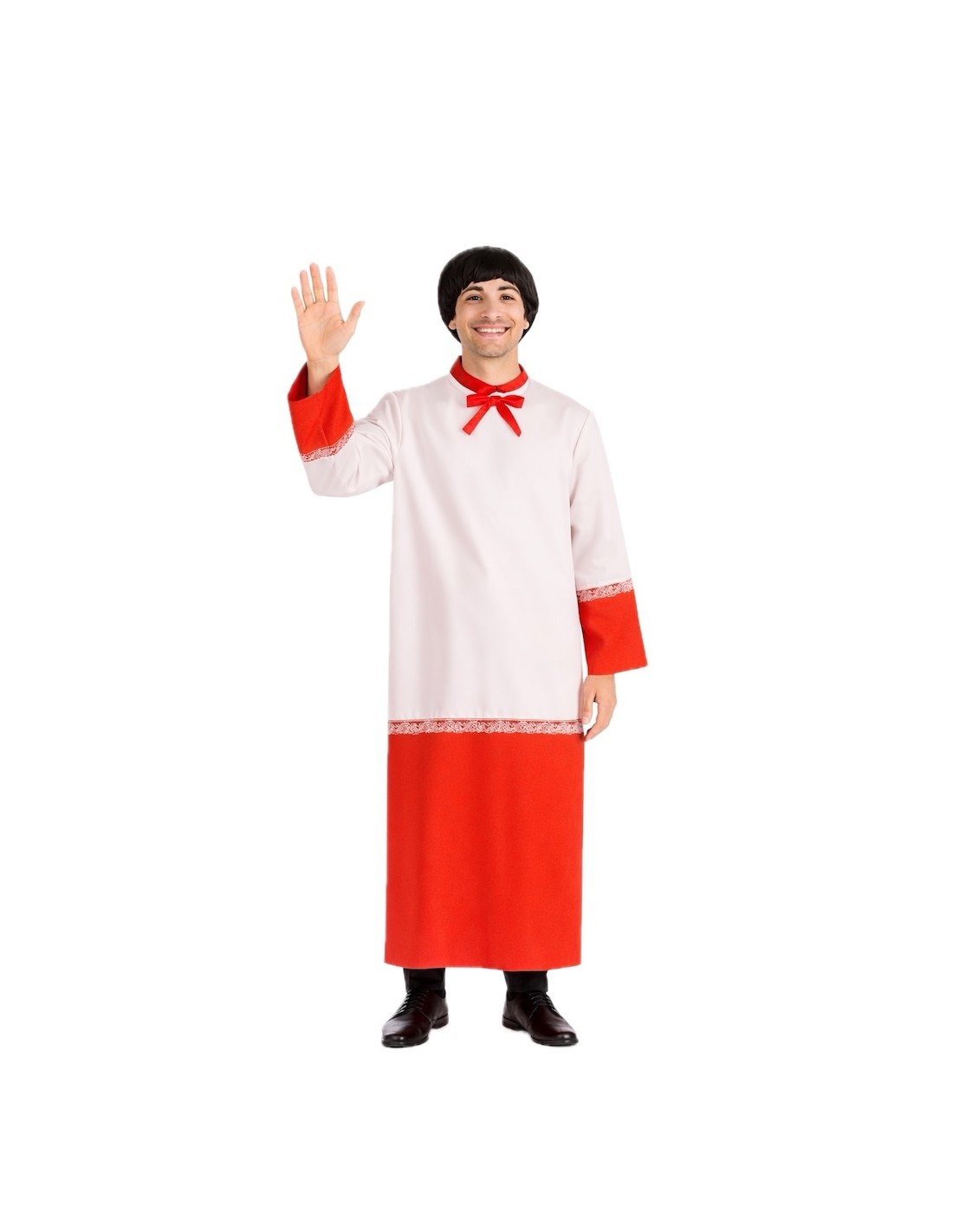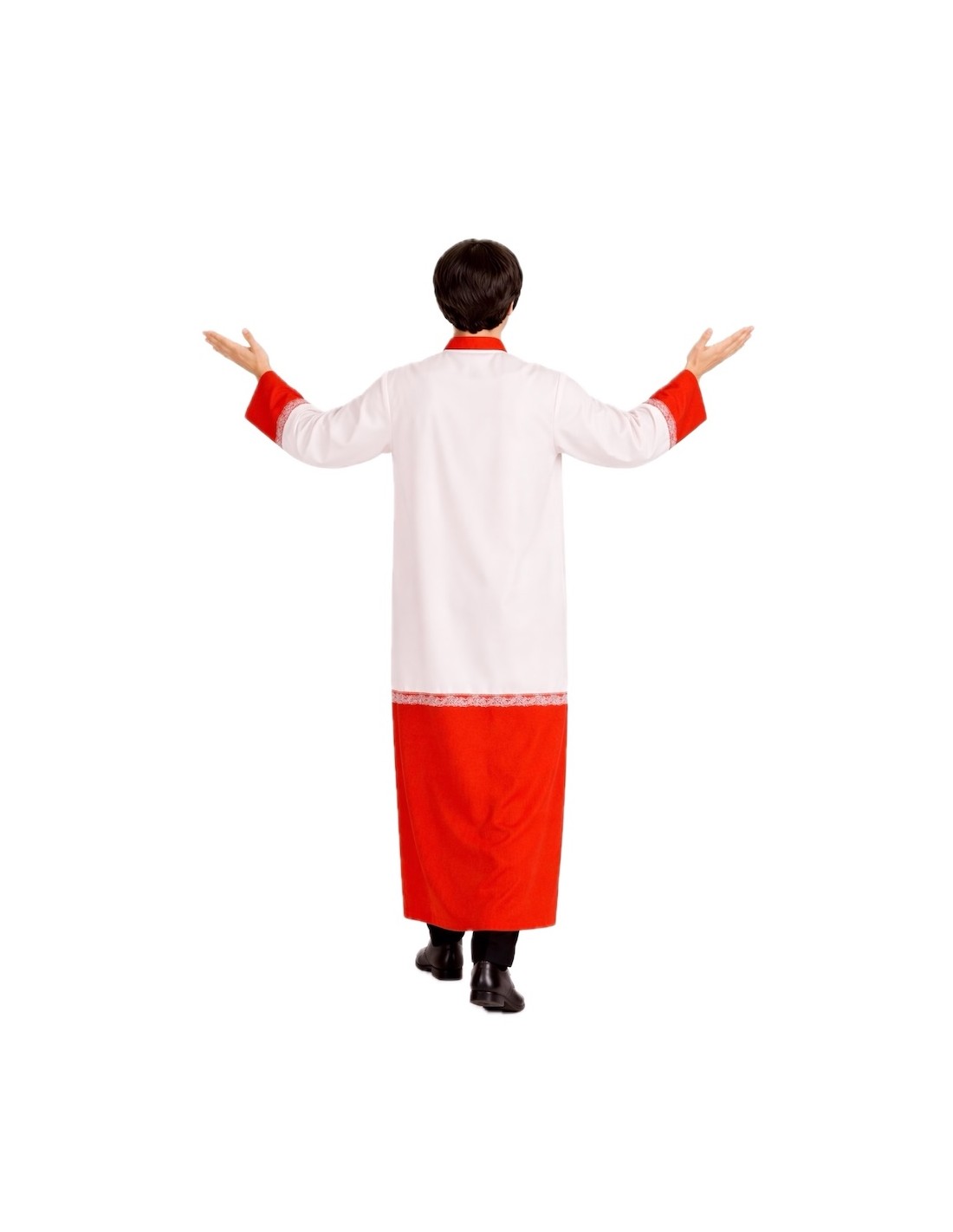 Un classique d'un grand réalisme, confectionné dans un tissu doux et résistant pour un confort maximal pendant des heures. Bien qu'il s'agisse d'une seule pièce, il recrée parfaitement la tenue authentique : une longue tunique rouge qui simule une soutane et une surplis blanc par-dessus. Le col est orné d'un nœud en satin rouge et le surplis est orné de dentelle blanche aux manches et à l'ourlet, offrant une finition soignée et très voyante. De coupe ample et légère, il offre une liberté de mouvement, avec un col rond et des manches amples qui mettent en valeur le style traditionnel. Les finitions et les coutures soignées facilitent son enfilage et son entretien. Pratique et polyvalent, il est idéal pour les carnavals, les fêtes à thème, les représentations et les événements populaires.