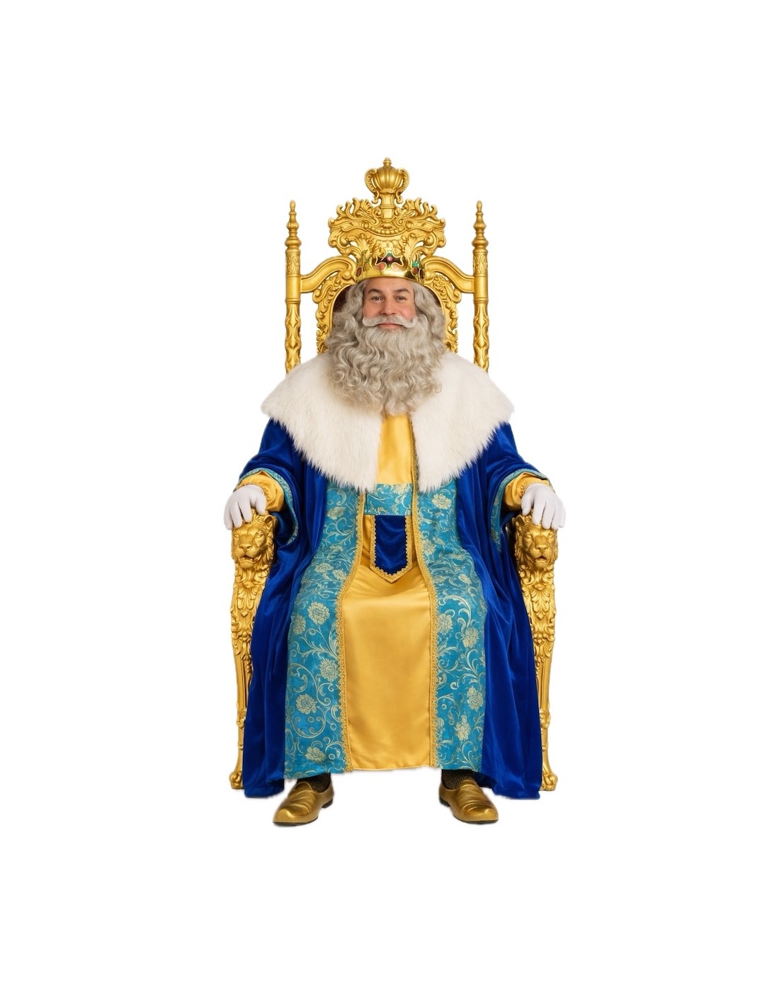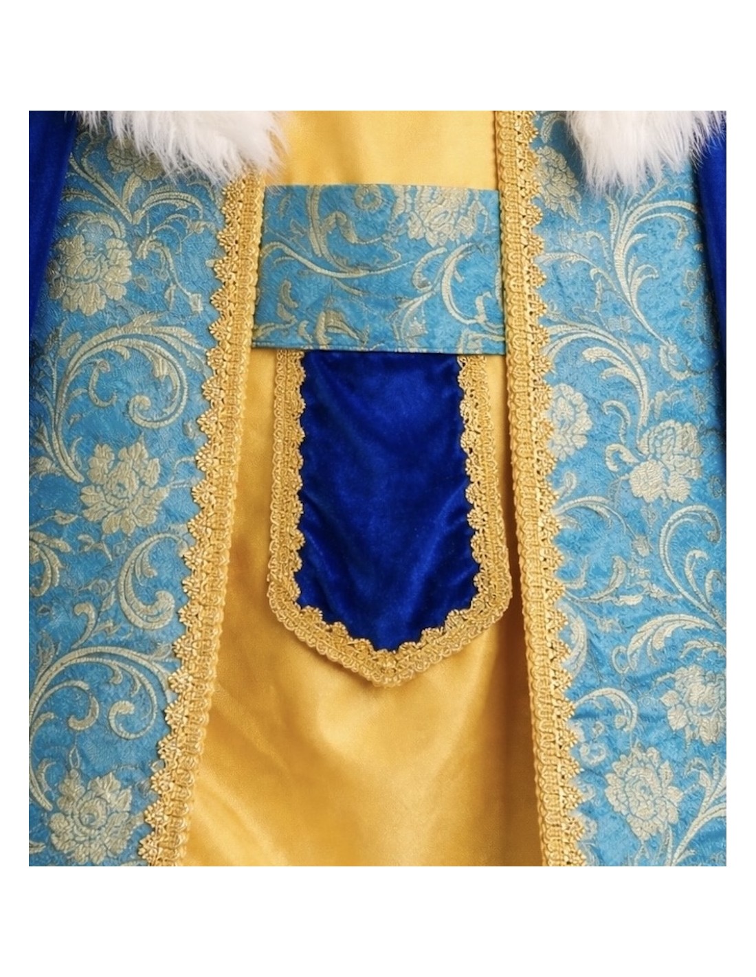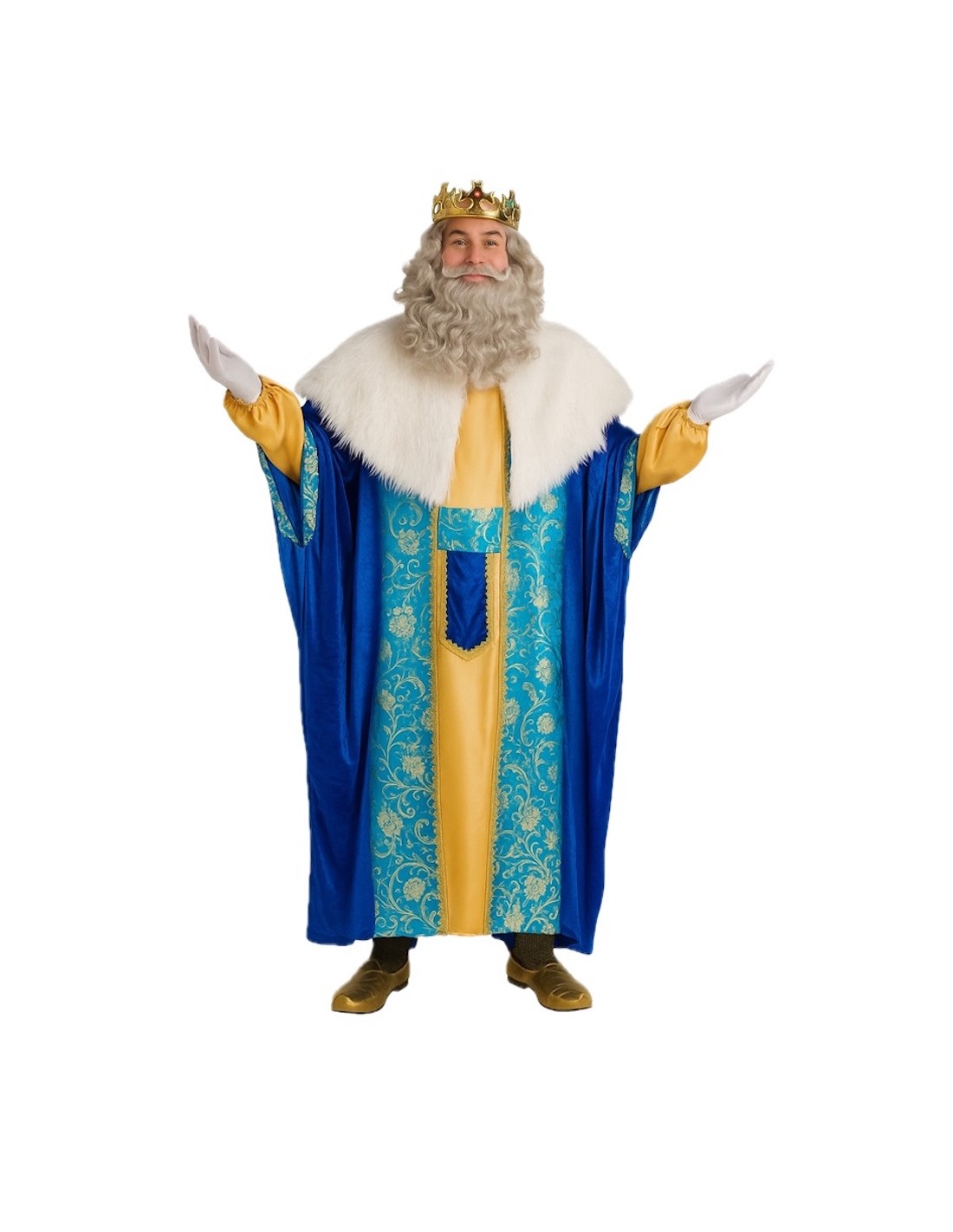 Éblouissez comme un véritable Roi Mage avec ce luxueux costume de grande qualité. Il comprend une cape en velours doux avec un col en fausse fourrure, rehaussée par un devant et des manches en un exquis tissu brocart façon damas et une délicate passementerie dorée. La tunique en satin fluide, avec des poignets élastiques confortables et une fermeture arrière en velcro, apporte une touche royale et élégante. Pour compléter l'ensemble, une spectaculaire ceinture en brocart et velours avec des détails dorés, ajustable avec un nœud. Idéal pour les défilés, les cavalcades et les événements inoubliables.