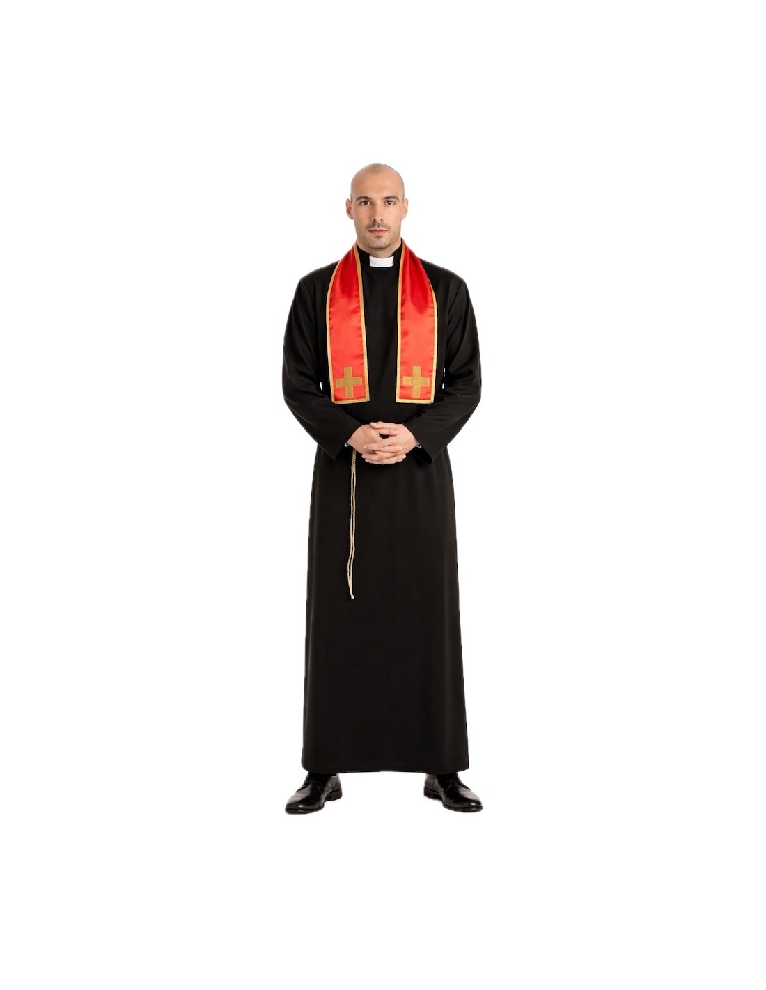 Déguisement de prêtre élégant et réaliste composé d'une longue soutane en polyester dense et doux, avec un col romain intégré et une fermeture pratique en velcro à l'arrière, au niveau du cou. Il comprend une étole en satin avec une bordure dorée et des croix dorées plastifiées en relief, fixées à la pièce, ce qui lui confère une touche solennelle et authentique. L'ensemble est complété par un cordon en nylon pour ajuster la taille, offrant une finition impeccable et professionnelle.