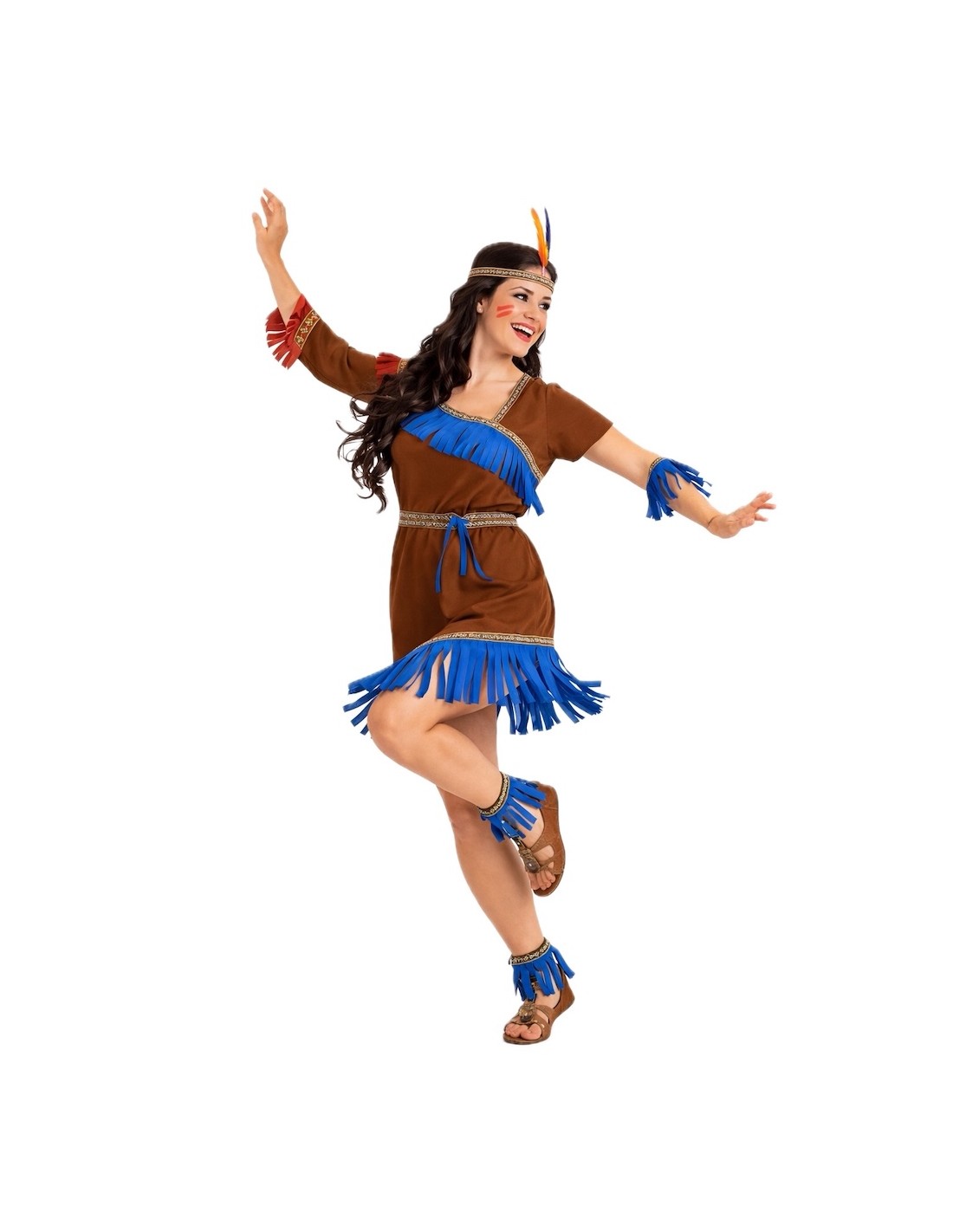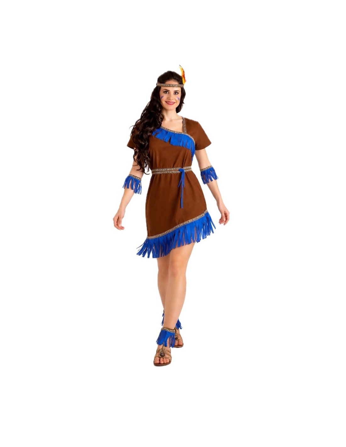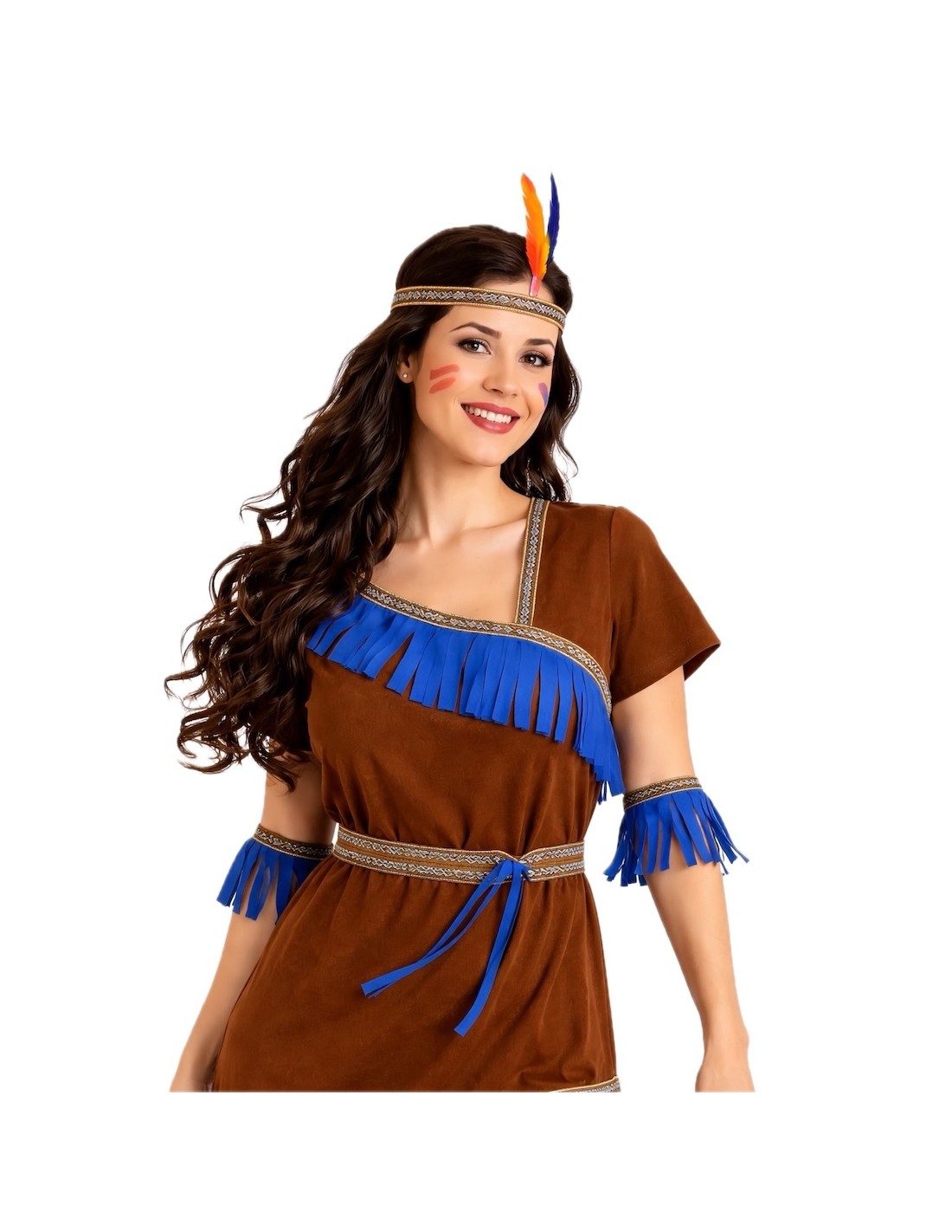 Ce costume d'indienne allie tradition et fantaisie grâce à une confection de grande qualité et des détails soignés. La robe, en polyester au toucher velouté, présente un décolleté croisé (sans ouverture), une taille élastique pour un ajustement confortable et une fermeture au cou avec du velcro. Elle est décorée de rubans aux motifs indigènes et de franges bleu électrique qui apportent de la couleur et de l'authenticité. Le point fort du costume réside dans ses accessoires : des bracelets et des chevillères élastiques assortis à la robe, ainsi qu'un bandeau orné de plumes pour compléter le look avec une touche tribale et festive. Un ensemble doux, résistant et voyant, idéal pour le Carnaval, les fêtes scolaires et les célébrations à thème pleines d'aventure.