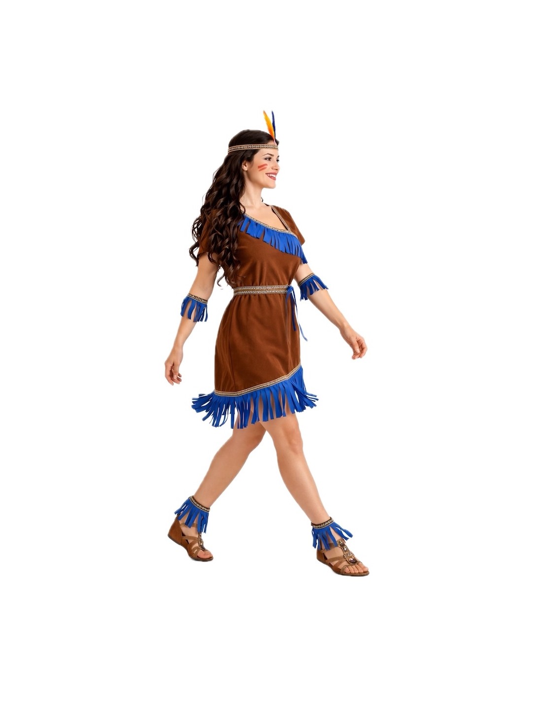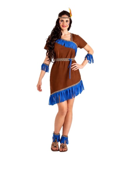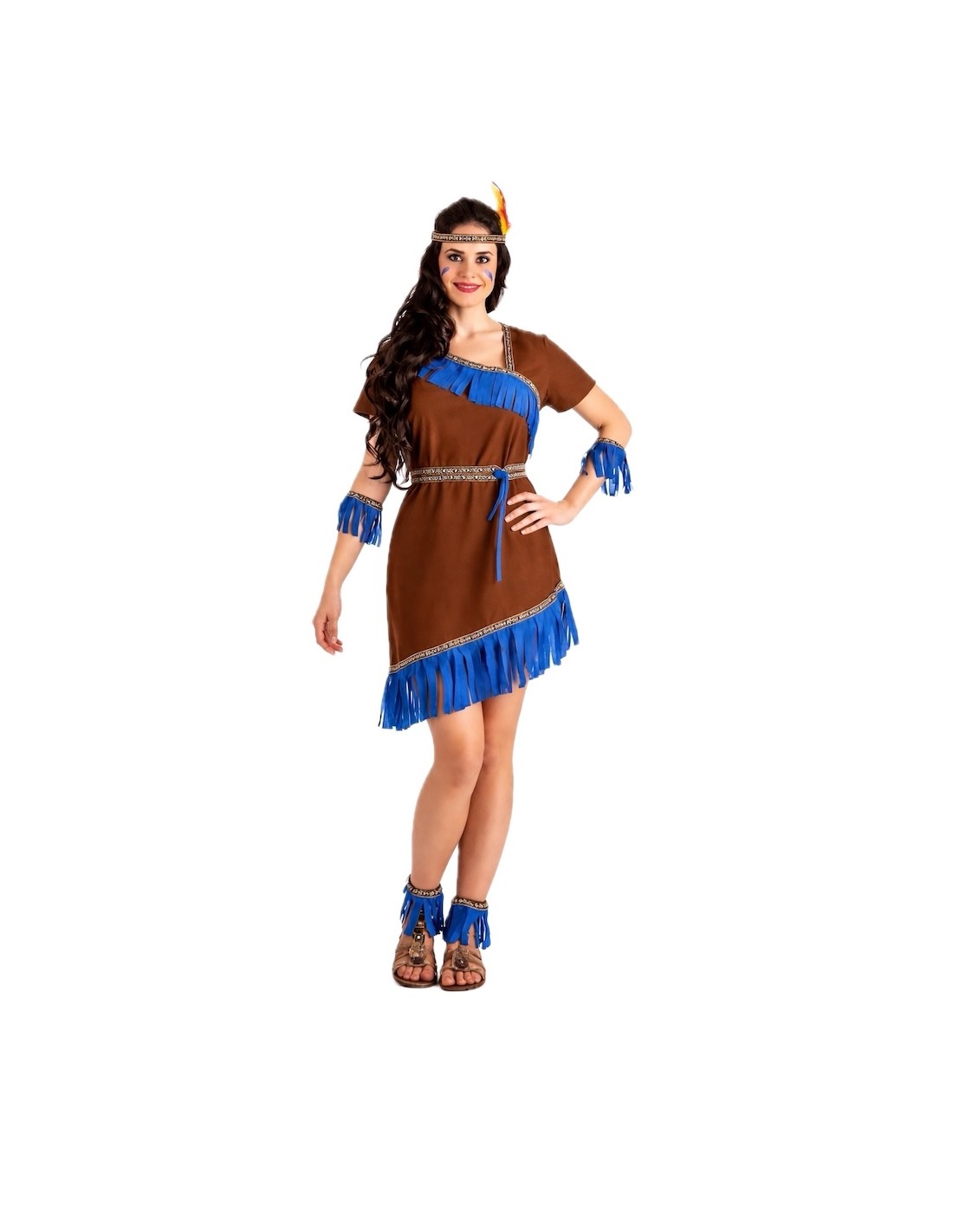 Ce costume d'indienne allie tradition et fantaisie grâce à une confection de grande qualité et des détails soignés. La robe, en polyester au toucher velouté, présente un décolleté croisé (sans ouverture), une taille élastique pour un ajustement confortable et une fermeture au cou avec du velcro. Elle est décorée de rubans aux motifs indigènes et de franges bleu électrique qui apportent de la couleur et de l'authenticité. Le point fort du costume réside dans ses accessoires : des bracelets et des chevillères élastiques assortis à la robe, ainsi qu'un bandeau orné de plumes pour compléter le look avec une touche tribale et festive. Un ensemble doux, résistant et voyant, idéal pour le Carnaval, les fêtes scolaires et les célébrations à thème pleines d'aventure.