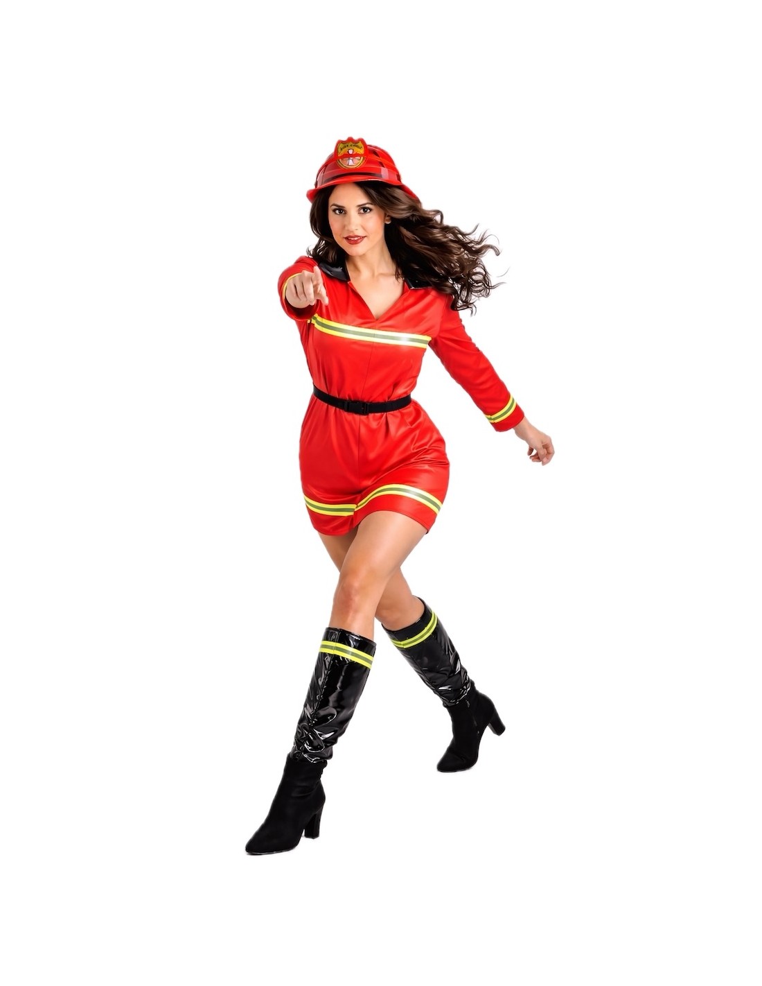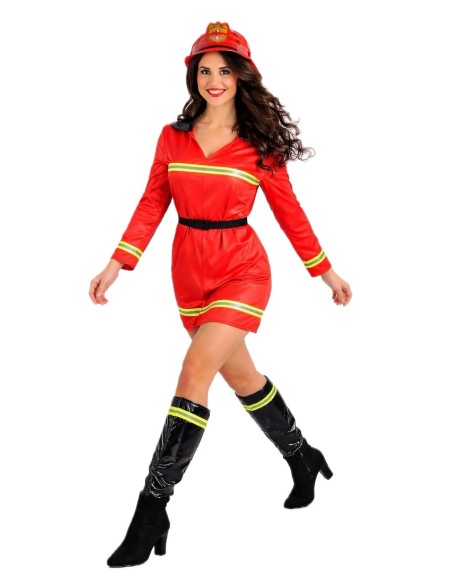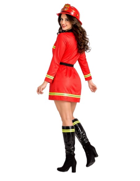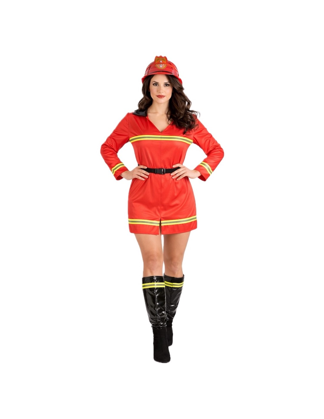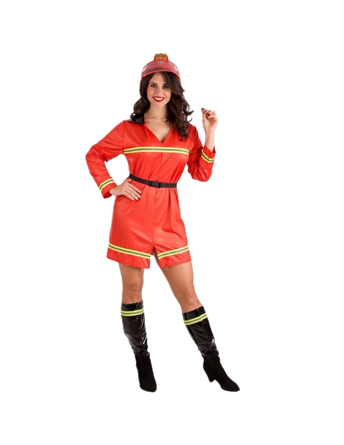 Déguisement de pompier très sympa et complet, de grande qualité, il s'agit d'une robe en maille douce semi-élastique, avec un effet visuel simili cuir et un col effet verni. Il comprend des bandes réfléchissantes (non fluorescentes) sur la poitrine, les manches et le bas. Il comprend des couvre-bottes en effet verni décorés des mêmes bandes pour créer un ensemble harmonieux. Et il est complété par une ceinture en nylon avec boucle, optionnelle pour ajuster la taille.
