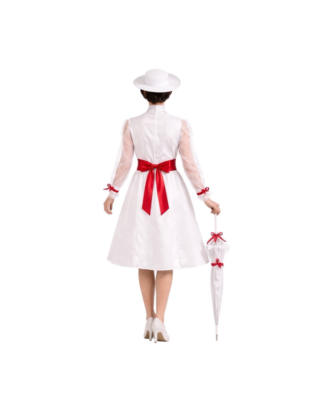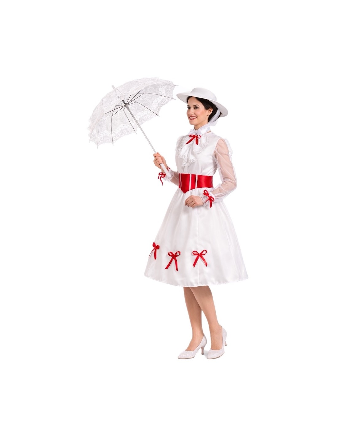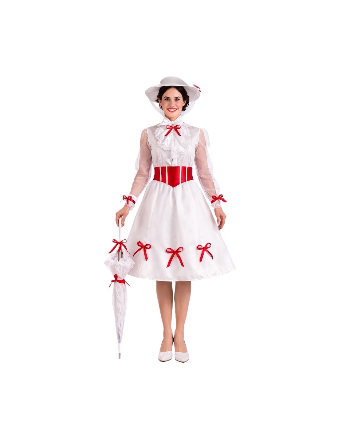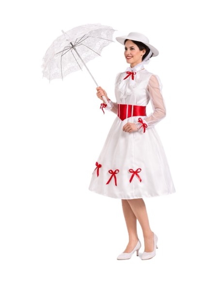 Un design élégant et plein de charme. La robe est confectionnée en doux tricot de machine semi-élastique, se fermant au cou par du velcro et une ceinture élastique à la taille d'où part une jupe ample en satin dense avec beaucoup de volume. Les manches, en mousseline semi-transparente, apportent de la légèreté et sont décorées de délicats nœuds rouges qui mettent également en valeur les poignets, le col et le bas de la jupe. Sur la poitrine, une pièce avec de la dentelle blanche ajoute de la distinction. Pour ajuster, une ceinture en satin mousseux avec un nœud à l'arrière est incluse. L'ensemble est complété par un chapeau en mousse également, pour maintenir sa forme et sa structure impeccable, orné de nœuds rouges et d'un élégant voile de tulle intégré. Un costume de grande confection, détaillé et d'une finition de qualité.