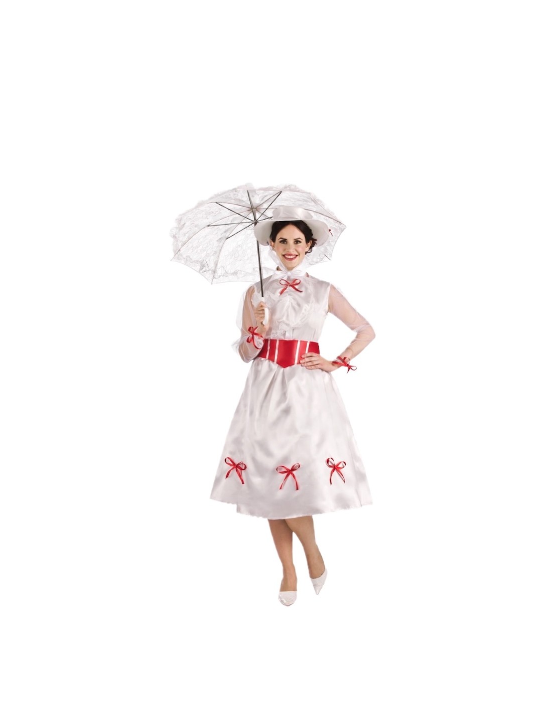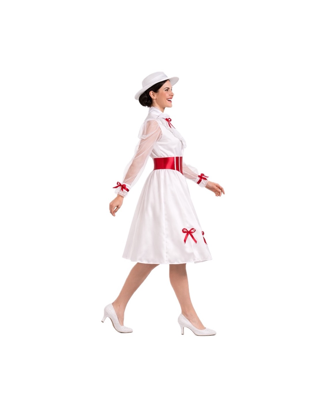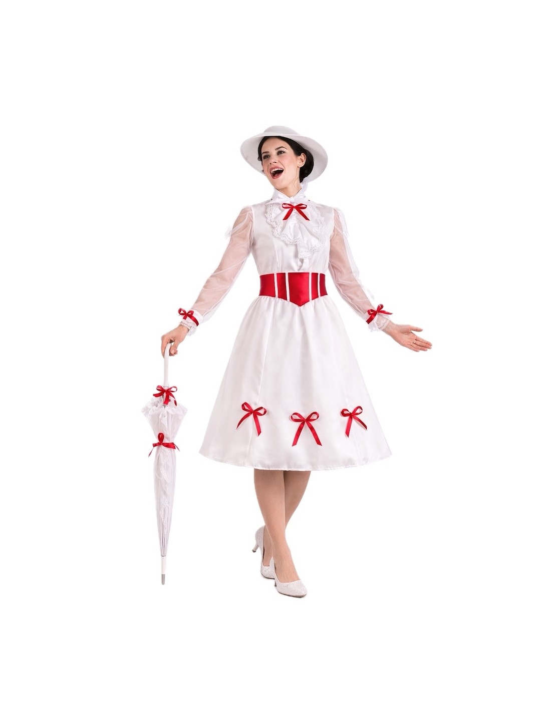 Un design élégant et plein de charme. La robe est confectionnée en doux tricot de machine semi-élastique, se fermant au cou par du velcro et une ceinture élastique à la taille d'où part une jupe ample en satin dense avec beaucoup de volume. Les manches, en mousseline semi-transparente, apportent de la légèreté et sont décorées de délicats nœuds rouges qui mettent également en valeur les poignets, le col et le bas de la jupe. Sur la poitrine, une pièce avec de la dentelle blanche ajoute de la distinction. Pour ajuster, une ceinture en satin mousseux avec un nœud à l'arrière est incluse. L'ensemble est complété par un chapeau en mousse également, pour maintenir sa forme et sa structure impeccable, orné de nœuds rouges et d'un élégant voile de tulle intégré. Un costume de grande confection, détaillé et d'une finition de qualité.