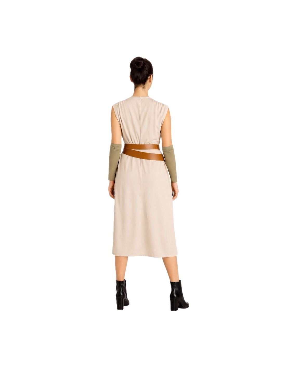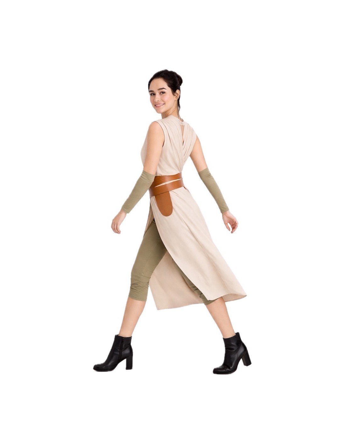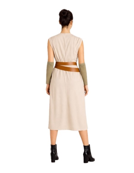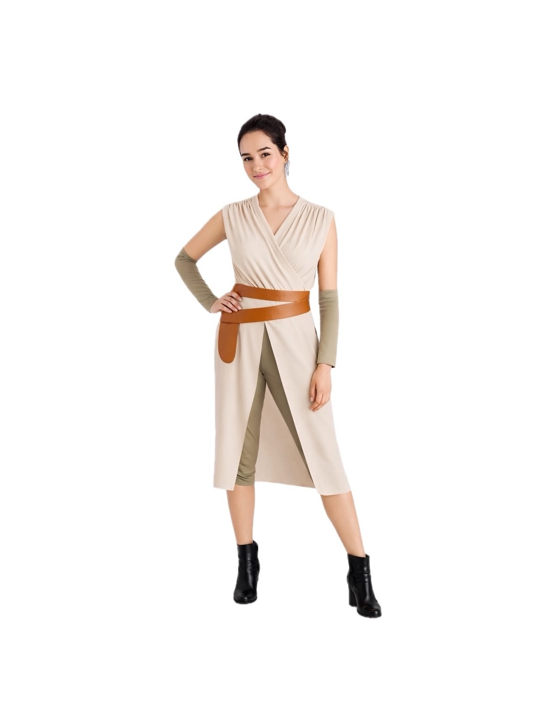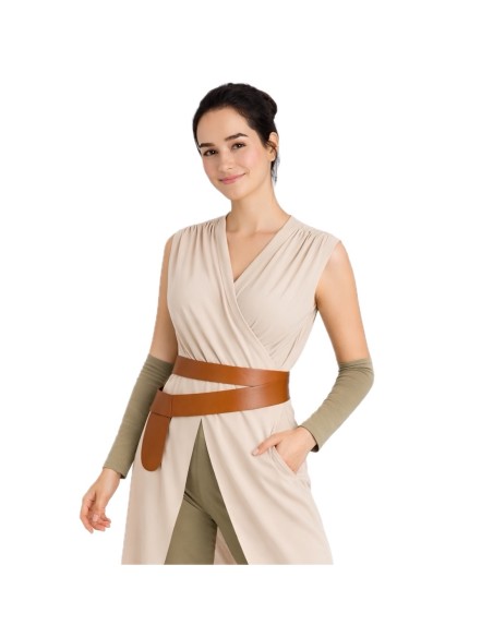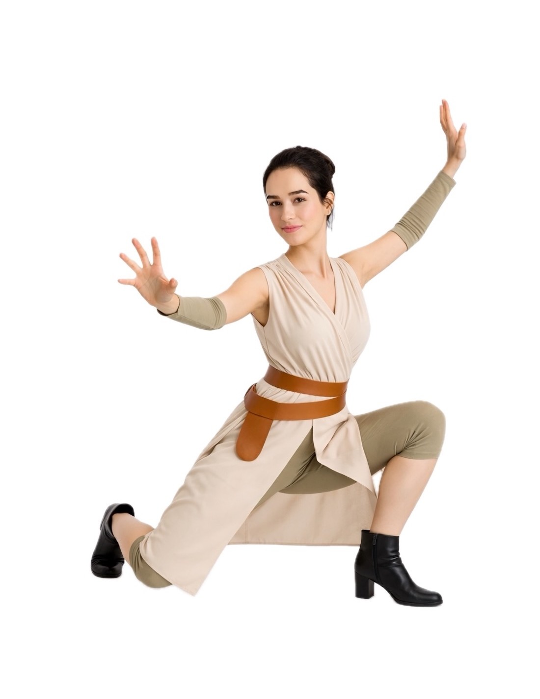 Un design inspiré par l'aventure spatiale, confectionné dans un doux tricot de machine semi-élastique à l'effet coton qui apporte confort et légèreté. Le t-shirt à col en V intègre deux pièces croisées à l'avant pour mettre en valeur la silhouette, maintenues par une ceinture en polyester avec une base en TNT qui apporte de la structure et se ferme dans le dos avec du velcro. L'ensemble comprend un pantalon assorti, avec une taille élastique, une poche intérieure et un élastique en bas pour un ajustement confortable au genou. Pour compléter la caractérisation, il est accompagné de protège-bras avec élastique au coude pour assurer une adhérence parfaite. Un costume de grande confection, pratique et rempli de détails qui évoquent la force et le style galactique.