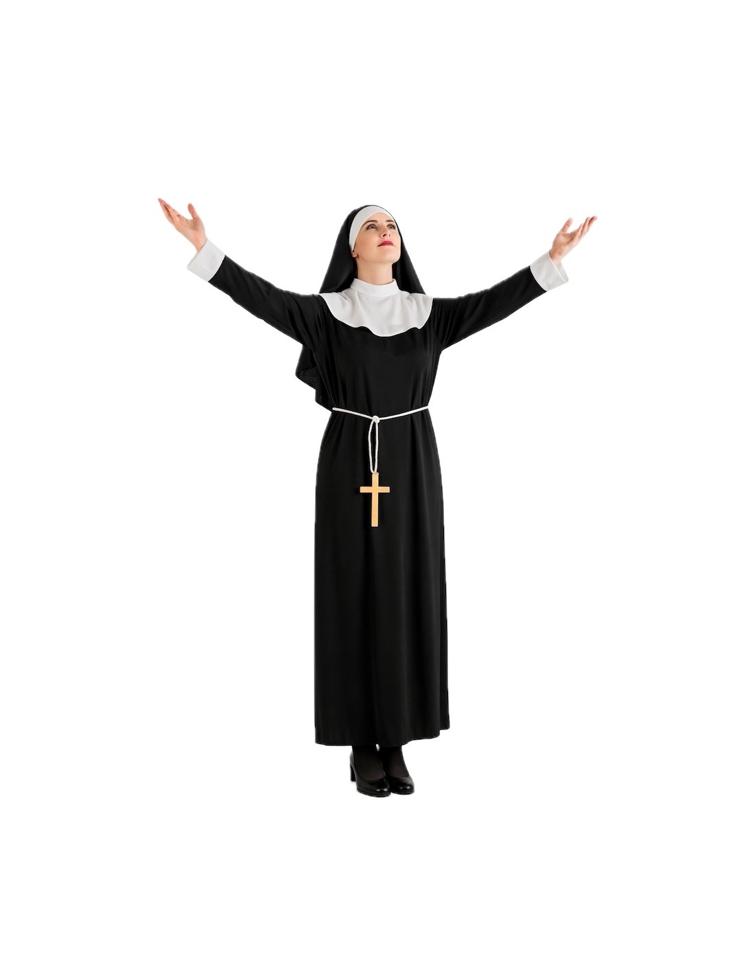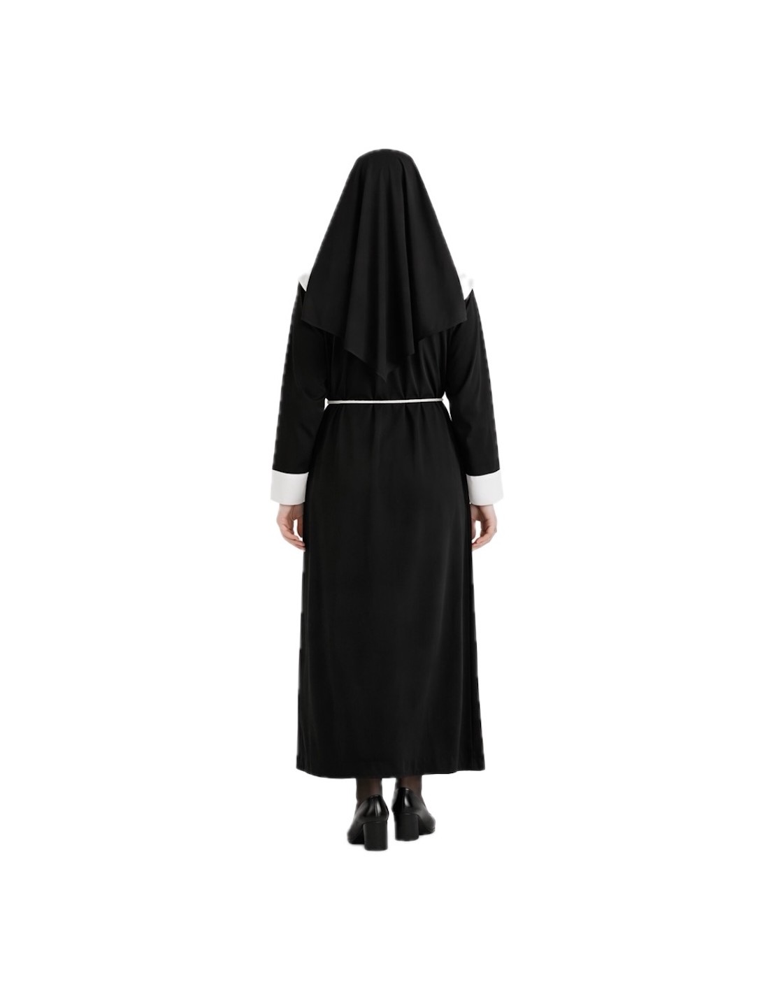 Ce déguisement polyvalent comprend une tunique ou une cagoule confectionnée dans un doux tissu en tricot semi-élastique offrant un grand confort et une grande mobilité. Le vêtement se ferme avec du velcro à l'arrière du cou, facilitant son enfilage. Les poignets, fabriqués en satin doux, apportent un contraste délicat et une finition élégante. Le bavoir ou le bonnet blanc, également en satin, se ferme avec du velcro pour un ajustement parfait et confortable. La coiffe combine des tissus en tricot et en satin, se fermant avec du velcro pour s'adapter à la tête sans perdre sa forme. Un cordon en polyester termine l'ensemble, serrant la taille et complétant le look avec une touche classique.
