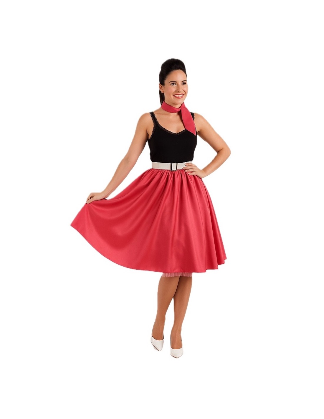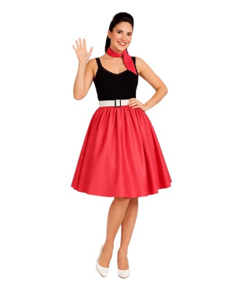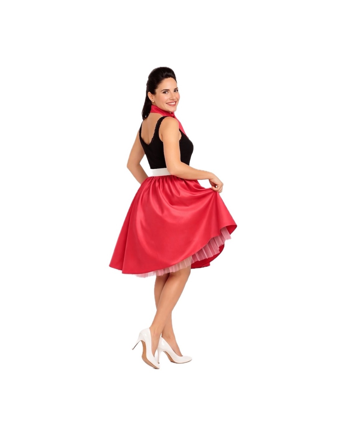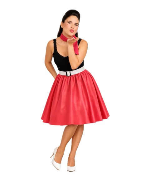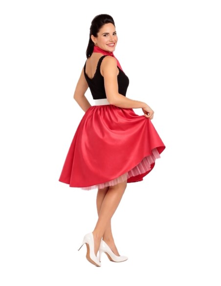 Un ensemble classique et charmant qui rend hommage au style rockabilly. La jupe à coupe évasée est fabriquée en satin doux et dense, avec une taille élastique froncée qui apporte du volume, de l'ampleur et du confort. Le bas est décoré de tulle qui ajoute une touche coquine et de mouvement en marchant. Il est accompagné d'une ceinture rigide à l'aspect verni, fabriquée en plastique sur une base de TNT pour maintenir sa forme, et décorée d'une boucle en plastique à effet métallique ; elle se ferme à l'arrière avec du velcro. Le tout est complété par un foulard assorti pour le cou, apportant le détail rétro parfait.