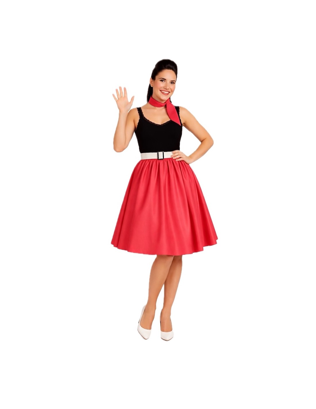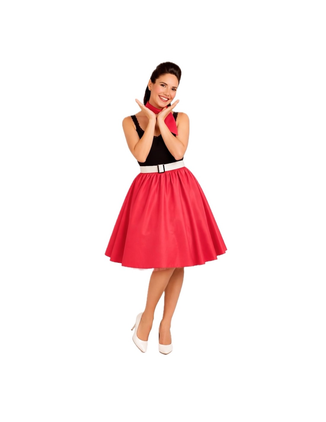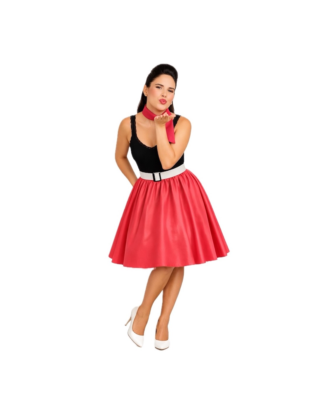 Un ensemble classique et charmant qui rend hommage au style rockabilly. La jupe à coupe évasée est fabriquée en satin doux et dense, avec une taille élastique froncée qui apporte du volume, de l'ampleur et du confort. Le bas est décoré de tulle qui ajoute une touche coquine et de mouvement en marchant. Il est accompagné d'une ceinture rigide à l'aspect verni, fabriquée en plastique sur une base de TNT pour maintenir sa forme, et décorée d'une boucle en plastique à effet métallique ; elle se ferme à l'arrière avec du velcro. Le tout est complété par un foulard assorti pour le cou, apportant le détail rétro parfait.