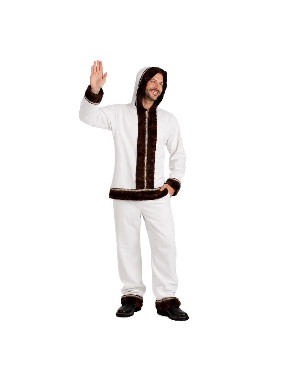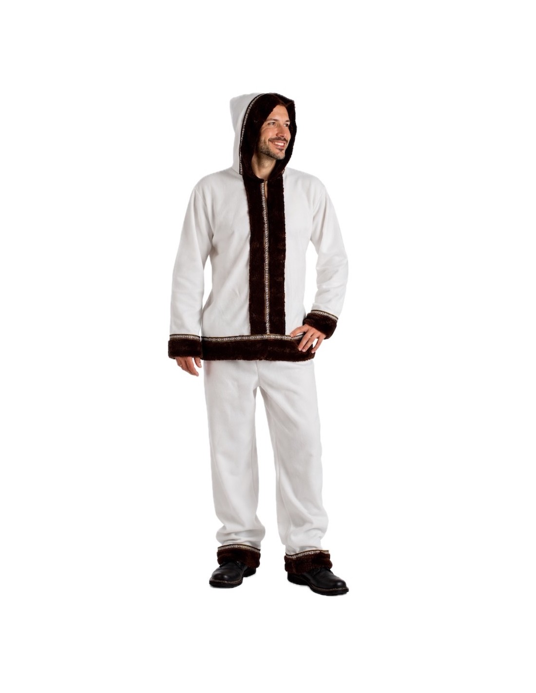Authentique et chaud déguisement d'esquimau pour adulte, composé d'un manteau long avec capuche intégrée, confectionné dans un tissu en peluche ultra doux et très agréable au toucher. Décoré d'élégants détails en velours aux poignets, à la capuche, au centre et en bas, à l'avant et à l'arrière, et rehaussé d'un ruban coloré avec motif Sami. Le pantalon, avec une taille élastique et une poche intérieure, comprend les mêmes ornements en bas pour harmoniser l'ensemble. Un design fidèle à la tenue traditionnelle, de grande qualité et d'une finition impeccable.