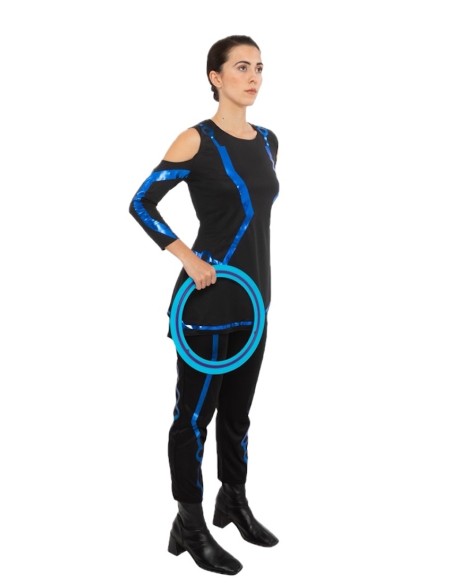 Ce costume, confectionné en maille semi-élastique, se compose de deux pièces : un t-shirt et un pantalon. Les deux sont décorés à la fois à l'avant et à l'arrière avec des bandes de couleur bleu métallique appliquées. Le t-shirt se ferme au cou avec un système de velcro, tandis que le pantalon est ajusté à la taille avec un élastique.