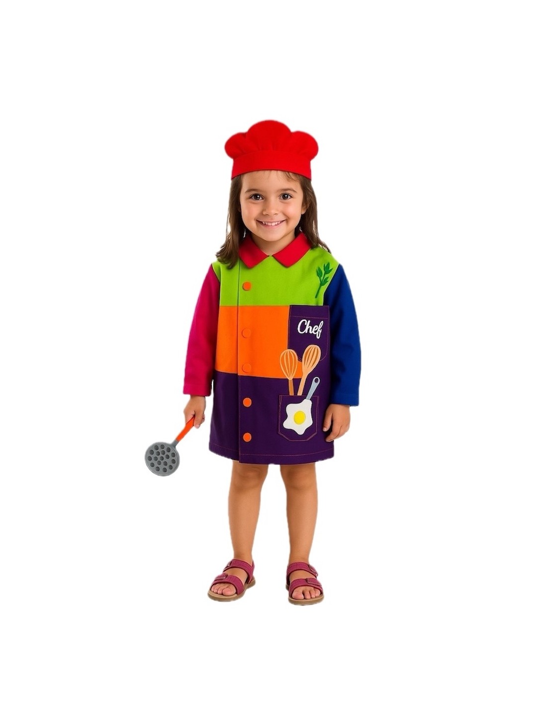 Ensemble d'artisanat et déguisement enfant de chef cuisinier à faire soi-même, recommandé pour les 4 à 6 ans. Comprend une blouse colorée fabriquée en tissu doux et résistant, avec fermeture en velcro à l'arrière du cou et décorée avec une impression numérique très réaliste. L'enveloppe en carton contient des accessoires imprimés que les enfants pourront découper et monter, dont une toque de chef à compléter avec l'élastique inclus pour l'ajuster à la tête. Il comprend également une barre de peinture pour le maquillage. Un jouet 3 en 1 : bricolage, déguisement et divertissement, idéal pour le Carnaval, les fêtes à thème, les anniversaires ou les jeux à la maison. Amusement garanti tout en apprenant en jouant !
