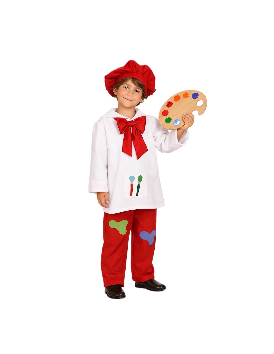 Laissez libre cours à l'imagination avec ce joyeux costume de peintre pour enfant, parfait pour les carnavals, les spectacles scolaires et les fêtes créatives. Il se compose d'un large tablier blanc à coupe droite avec fermeture velcro à l'arrière, col bébé et grand nœud en satin rouge cousu, orné d'une poche centrale et de pièces multicolores amusantes en feutre dense. Le pantalon rouge, avec une taille élastique, reprend la décoration colorée pour un look plein de vie et de confort. L'ensemble est complété par un sympathique bonnet de peintre froncé rouge avec élastique à l'arrière, qui reste bien en place même en jouant ou en dansant. Tout le costume est fabriqué en polyester au toucher de drap, léger et résistant. Un costume amusant, confortable et plein de couleurs qui fera de chaque petit artiste l'âme de la fête.