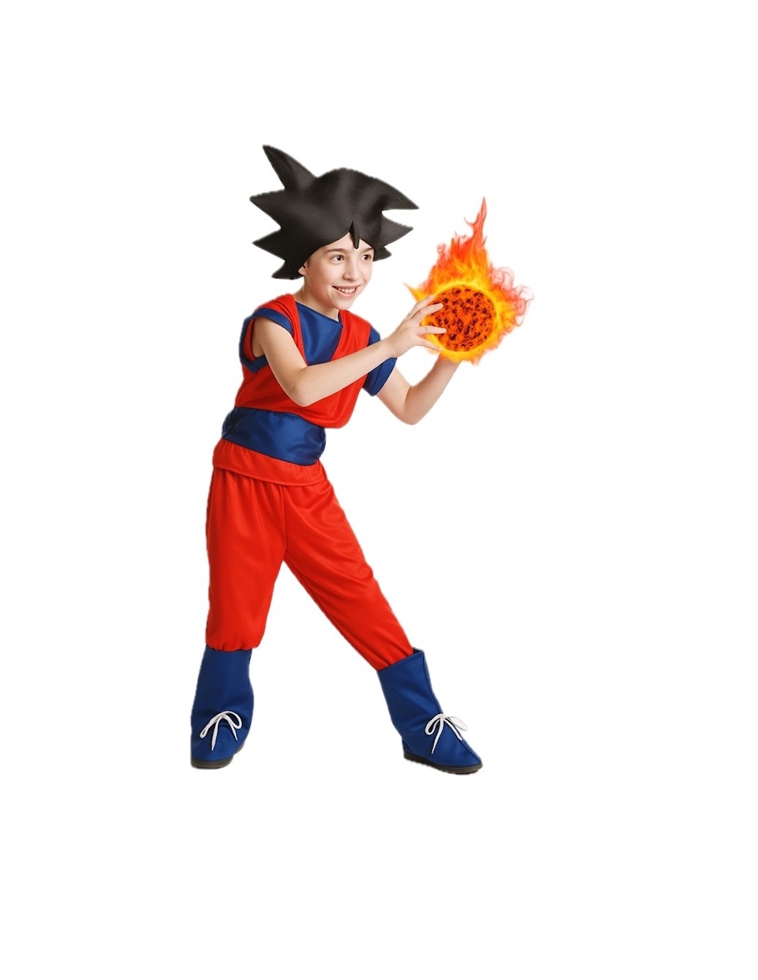 Ce costume attrayant, aux couleurs vives, est confectionné dans un point de machine semi-élastique doux et dense. Il est décoré sur le buste, les manches et la ceinture avec des appliques en satin bleu métallique. En bas, il comporte un pantalon confectionné en doux point de machine avec une taille élastique et une petite poche intérieure. Il est complété par des couvre-bottes et un chapeau / perruque fabriqués en satin et tissu TNT.