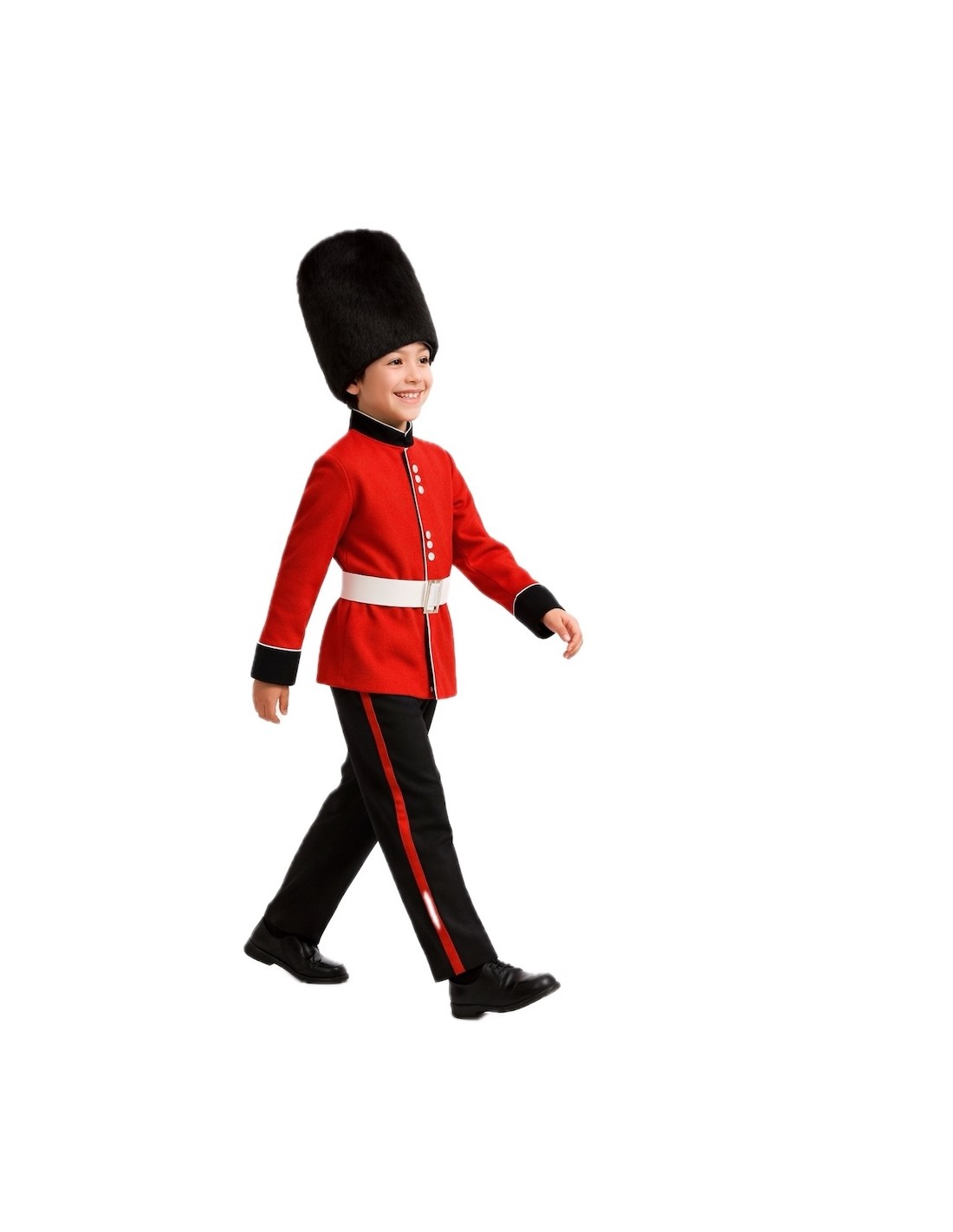 Déguisement classique de Garde Anglaise, élégant et avec tous les détails de l'uniforme traditionnel. Comprend une veste en polyester dense mais doux avec un col mao, décorée de rubans blancs et de boutons, avec une fermeture velcro à l'arrière du col. Le pantalon, en doux tissu semi-élastique avec une ceinture en caoutchouc, présente une bande de satin rouge sur les côtés. Il est complété par une ceinture brillante avec une boucle en plastique argenté et le chapeau emblématique avec des cheveux synthétiques qui caractérise le personnage, fabriqué sur un tissu tricoté, avec du caoutchouc à l'arrière pour pouvoir l'adapter confortablement.