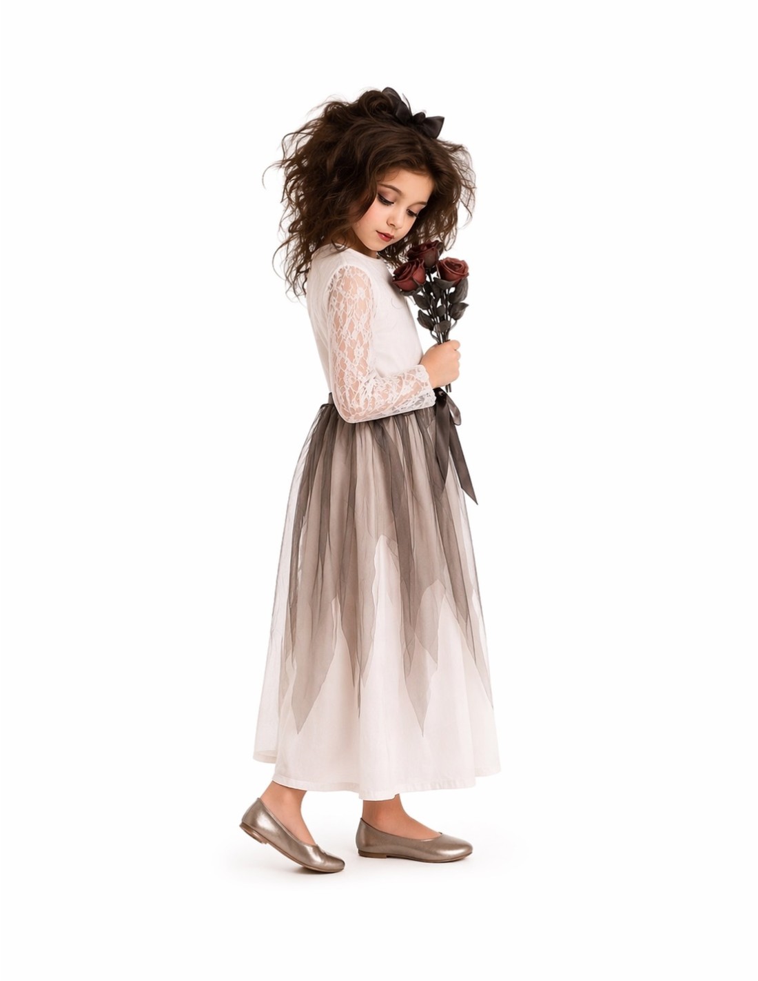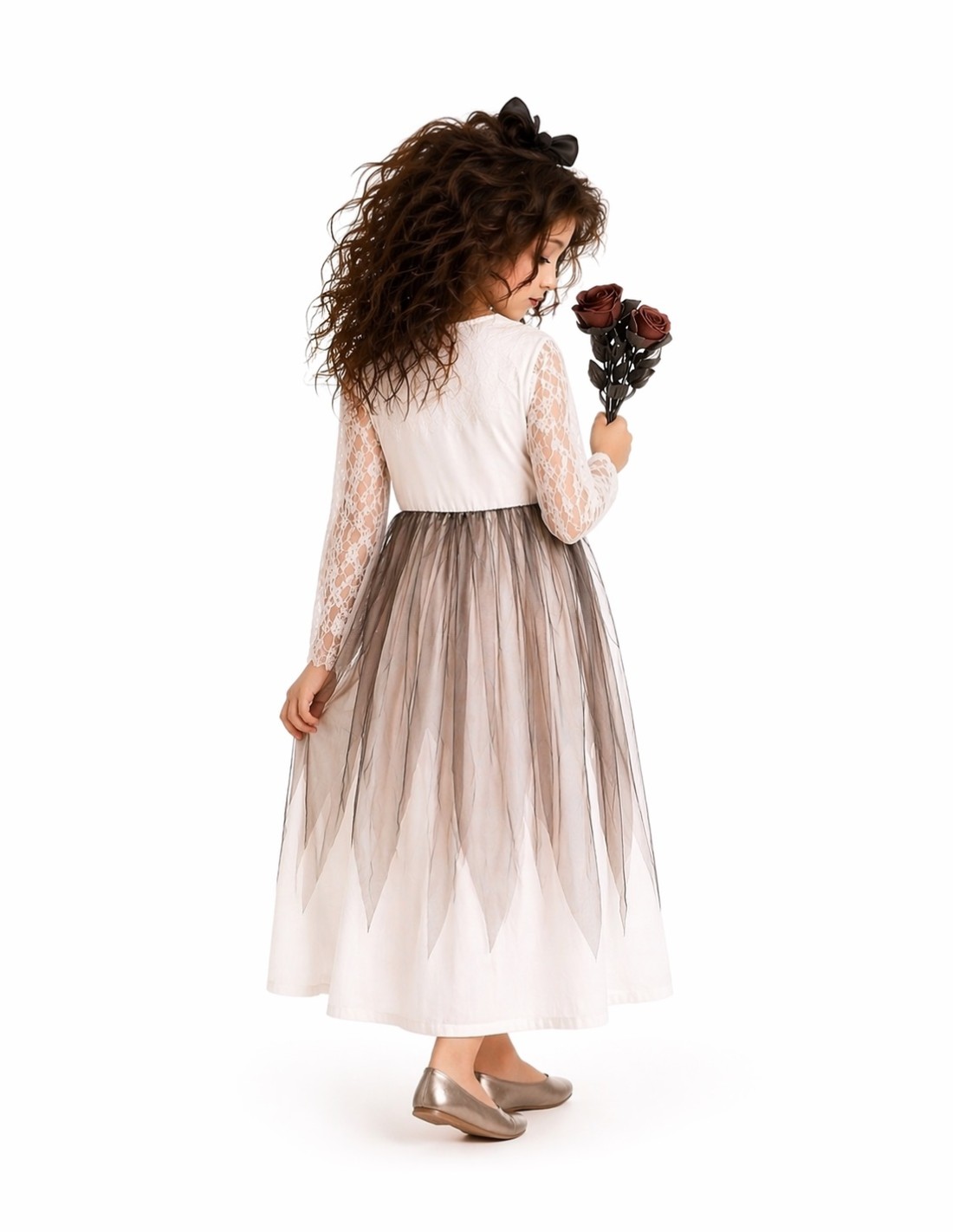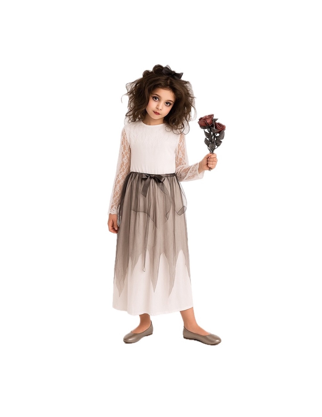 Un diseño original et sombre qui combine mystère et charme. La robe est fabriquée en doux tricot semi-élastique, avec une fermeture velcro au cou et un élastique à la taille pour un ajustement confortable. Le col et les manches se distinguent par leur délicat dentelle, apportant une touche élégante et sombre. À partir de la taille, les classiques lambeaux se déploient, réalisés dans un mélange de tissu léger et de tulle noir, ornés d'un nœud frontal qui rehausse l'ensemble. Le costume est complété par un serre-tête décoré du même nœud et des lambeaux en guise de voile nuptial, évoquant l'apparence d'une véritable mariée spectrale. Un costume confortable, d'une grande douceur dans sa dentelle et avec une finition très soignée, parfait pour Halloween ou les fêtes à thème.