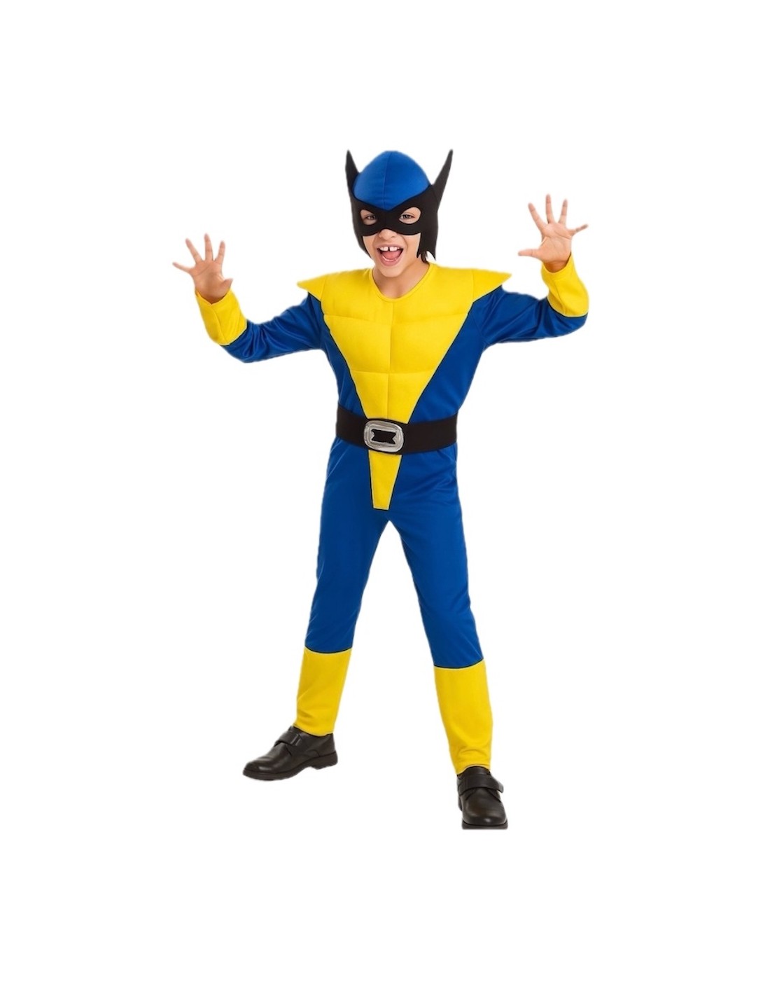 Il s'agit d'une combinaison intégrale fabriquée en doux tricot de machine. Elle comprend une section frontale qui simule des abdominaux, rembourrée de fibre de polyester pour plus de volume et de réalisme. La fermeture se fait à l'arrière à l'aide d'une fermeture éclair et comporte des épaulières externes en polyester moussé, ce qui apporte structure et définition. Les poignets des manches et des jambes, également en jaune, renforcent le design. Elle comprend une ceinture noire cousue directement sur la combinaison à l'avant, équipée d'une boucle moussée avec une finition argentée pour une touche distinctive. L'ensemble est complété par un masque fabriqué en polyester moussé doux, un matériau léger et résistant, conçu pour s'ajuster confortablement au visage.