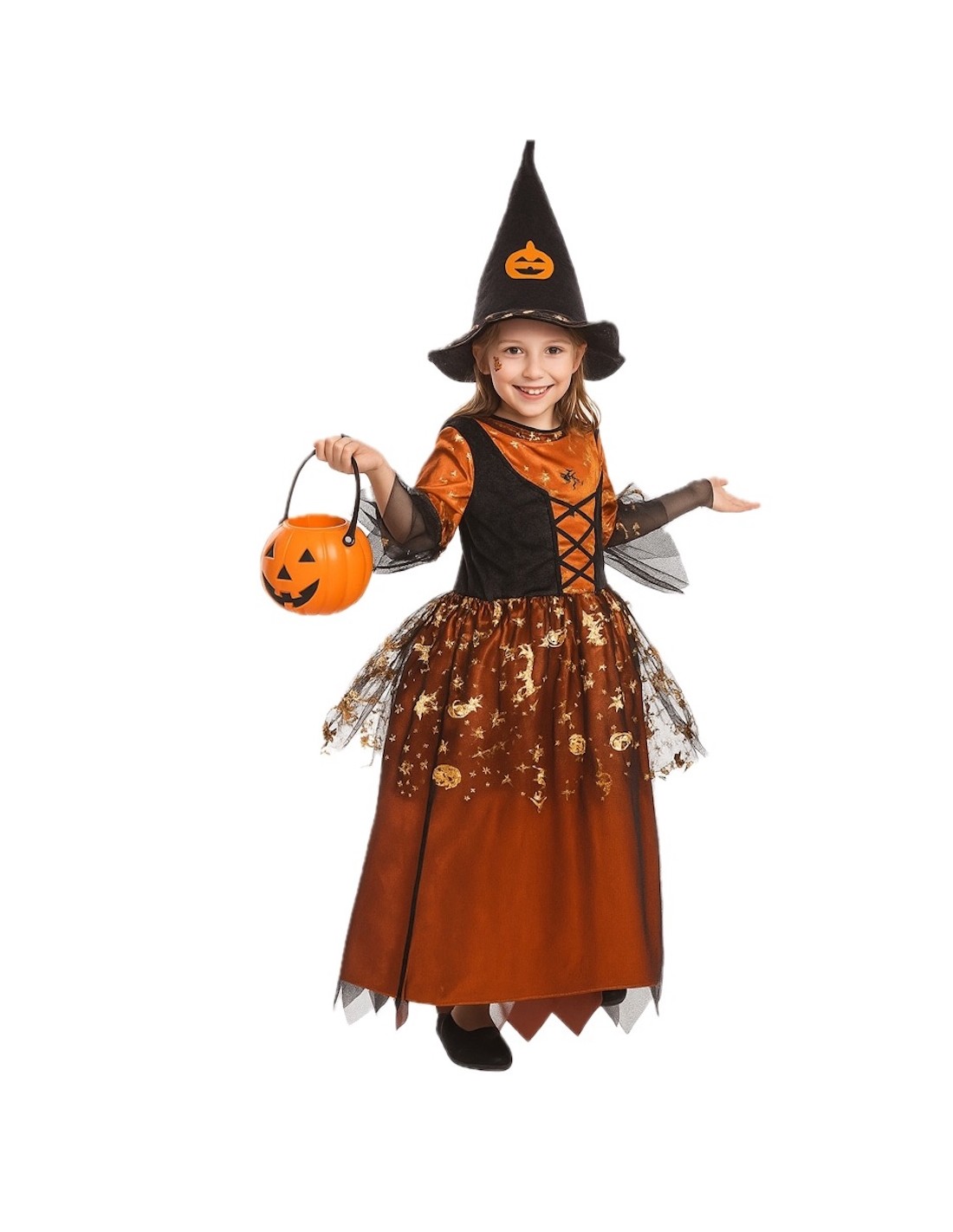 Ce déguisement classique et élégant se compose d'une robe confectionnée en satin doux, recouverte de tulle imprimé de motifs d'Halloween dorés. La fermeture se fait par velcro à l'arrière, tandis qu'à l'avant est ajouté un gilet en velours avec une fermeture caractéristique en zigzag. La jupe, avec une double couche de tulle pour plus de volume, est dotée d'une taille élastique pour un meilleur ajustement. L'ensemble est complété par le chapeau de sorcière typique, confectionné en velours et recouvert de filtre pour plus de corps et de structure, décoré du même tulle et motif que la robe, ainsi qu'une citrouille en filtre attachée au chapeau.