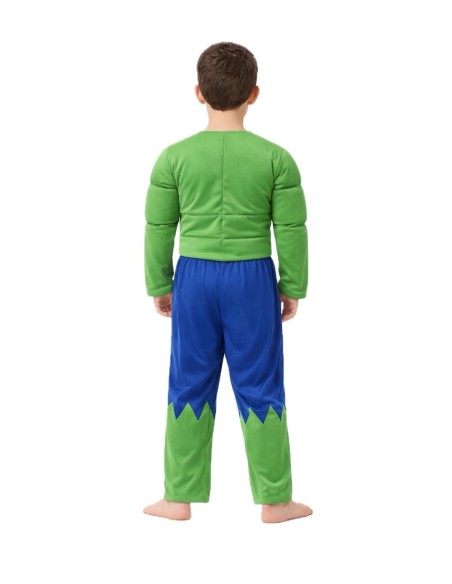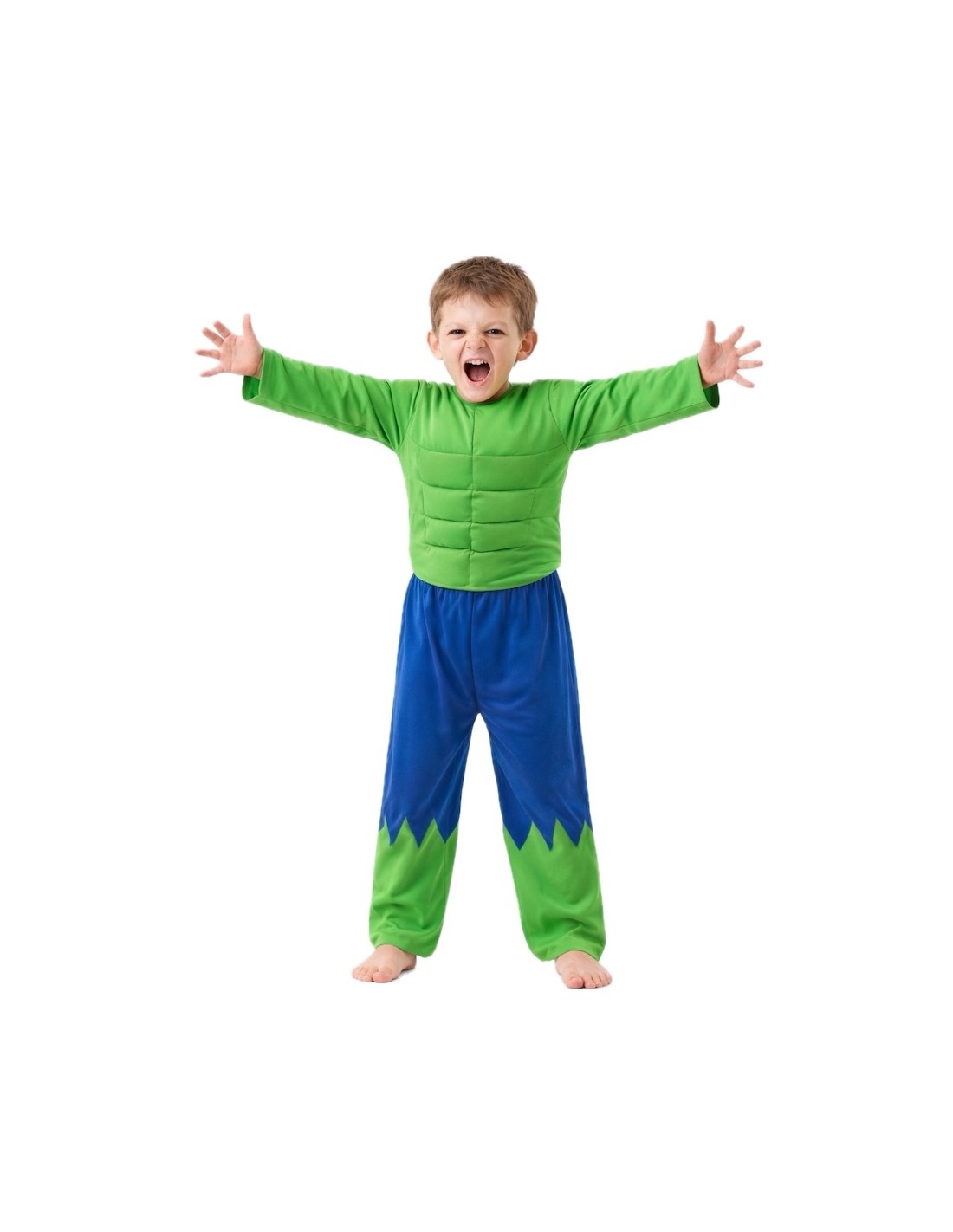 Ce costume, de qualité excellente, se compose de deux pièces : le t-shirt, fabriqué en doux jersey semi-élastique, présente un rembourrage léger mais dense sur l'avant et les bras pour imiter la musculature du personnage. Les muscles intérieurs sont recouverts d'un filtre doux pour plus de confort. Le t-shirt se ferme à l'arrière du cou avec du velcro. Le pantalon, fabriqué dans le même tissu confortable que le t-shirt, a une taille élastique et une petite poche intérieure. Le bas du pantalon est de la même couleur vert fluo que le t-shirt pour harmoniser l'ensemble.