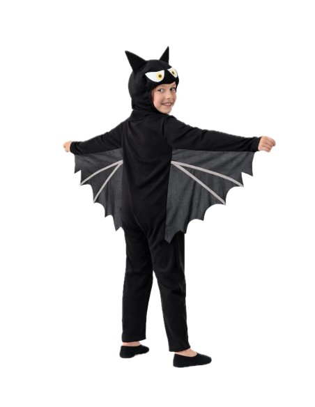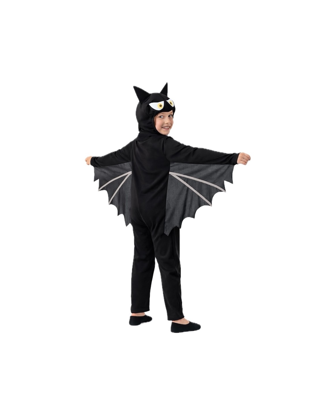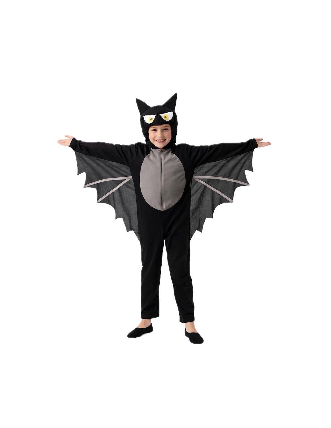 Ce costume original se compose d'une combinaison intégrale fabriquée en doux tricot semi-élastique avec une capuche intégrée. La capuche est recouverte d'un tissu filtrant pour plus de consistance et de structure. Elle comporte un élastique autour de la tête pour s'ajuster, et à la fois les yeux et les crocs sont fixés au tissu, étant d'un tissu filtrant dense. La combinaison se ferme à l'avant avec une fermeture éclair invisible et l'avant est fabriqué en polyester peau de pêche. À partir des manches, un tissu en tricot part sur les côtés de la combinaison, formant les ailes de la chauve-souris.