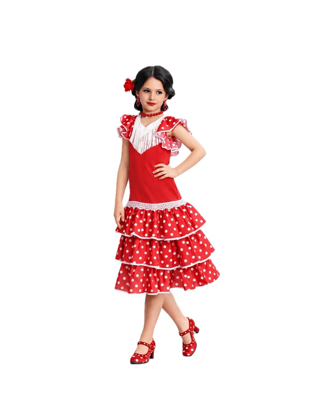 Ce costume de sévillane pour enfant incarne l'essence du costume traditionnel avec une confection confortable, légère et de grande qualité. Fabriqué en maille semi-élastique et satin doux, il offre un ajustement parfait et une liberté de mouvement. Le col complet présente les célèbres franges, tandis que les volants en satin, ornés de ruban blanc et de dentelle à la hanche, ajoutent grâce et authenticité. La pièce maîtresse du déguisement est son design traditionnel avec des pois et des couleurs emblématiques, évoquant la joie du flamenco et des foires andalouses. Une robe résistante, fraîche et charmante, idéale pour danser, jouer et briller lors du Carnaval, des fêtes scolaires ou des célébrations traditionnelles.