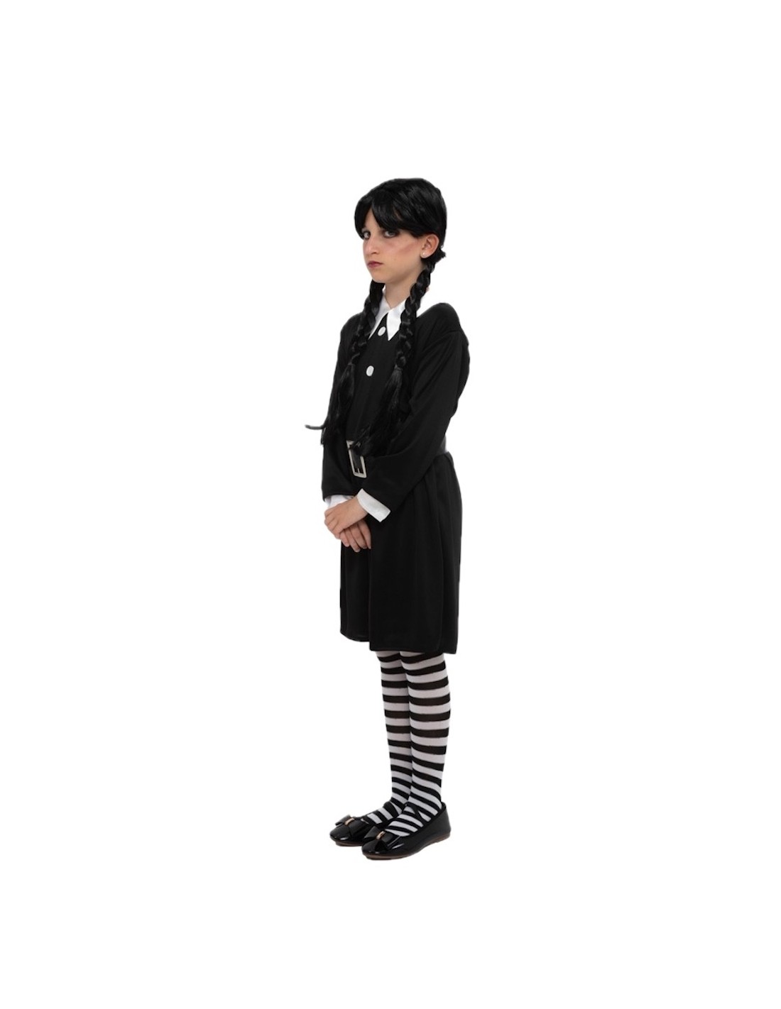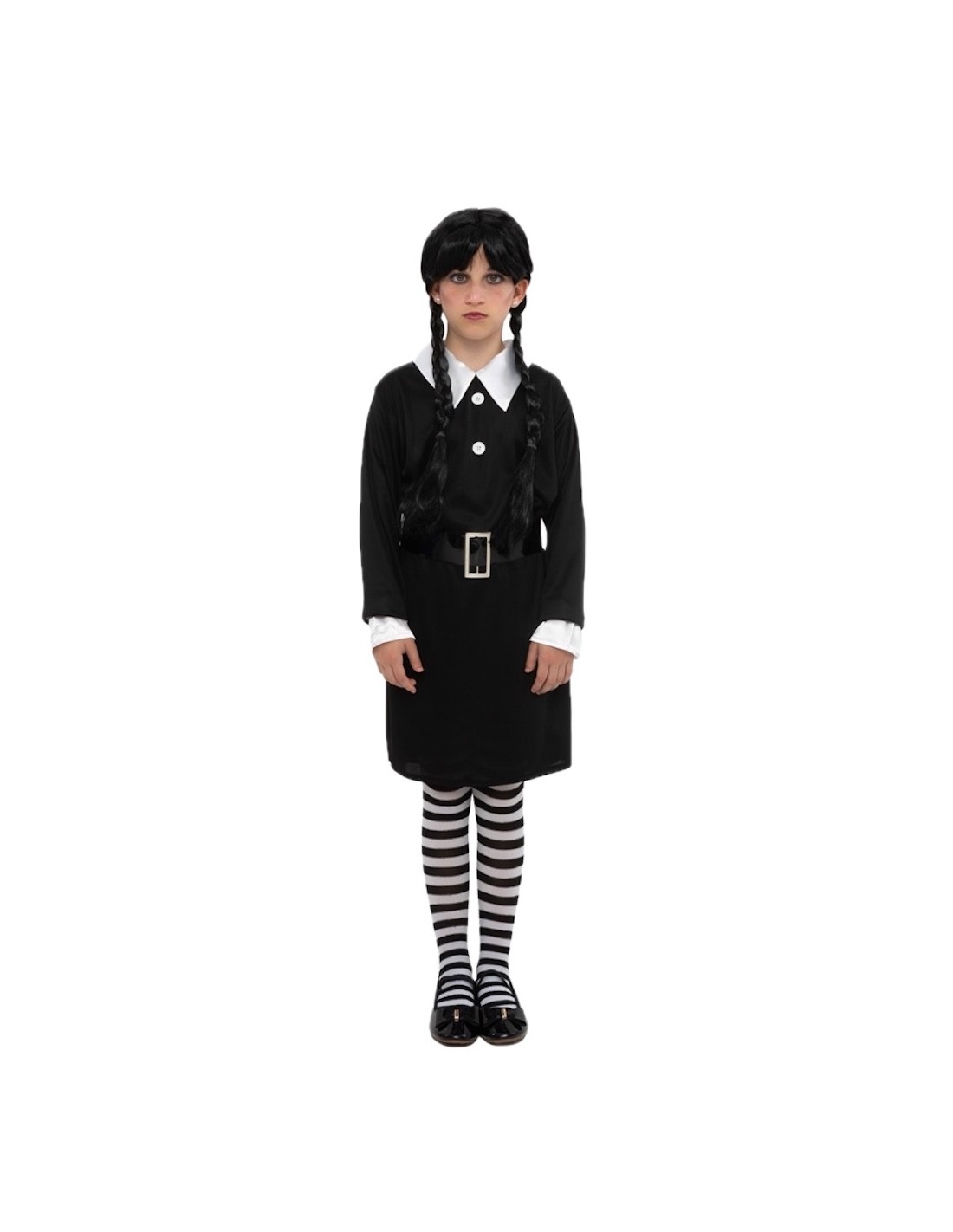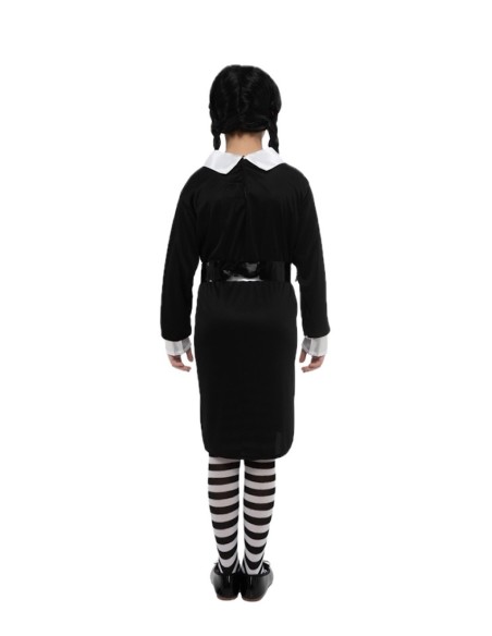 Découvrez l'attrait singulier de ce costume, idéal pour se démarquer à Halloween. Fabriquée dans un élégant tricot de machine, cette robe noire à manches longues avec des poignets blancs présente une texture douce et légèrement élastique. Sa coupe classique met en valeur la silhouette. Elle arbore un impeccable col blanc avec des boutons décoratifs et une large ceinture qui définit la taille avec un style gothique, et se complète avec des collants à rayures noires et blanches.