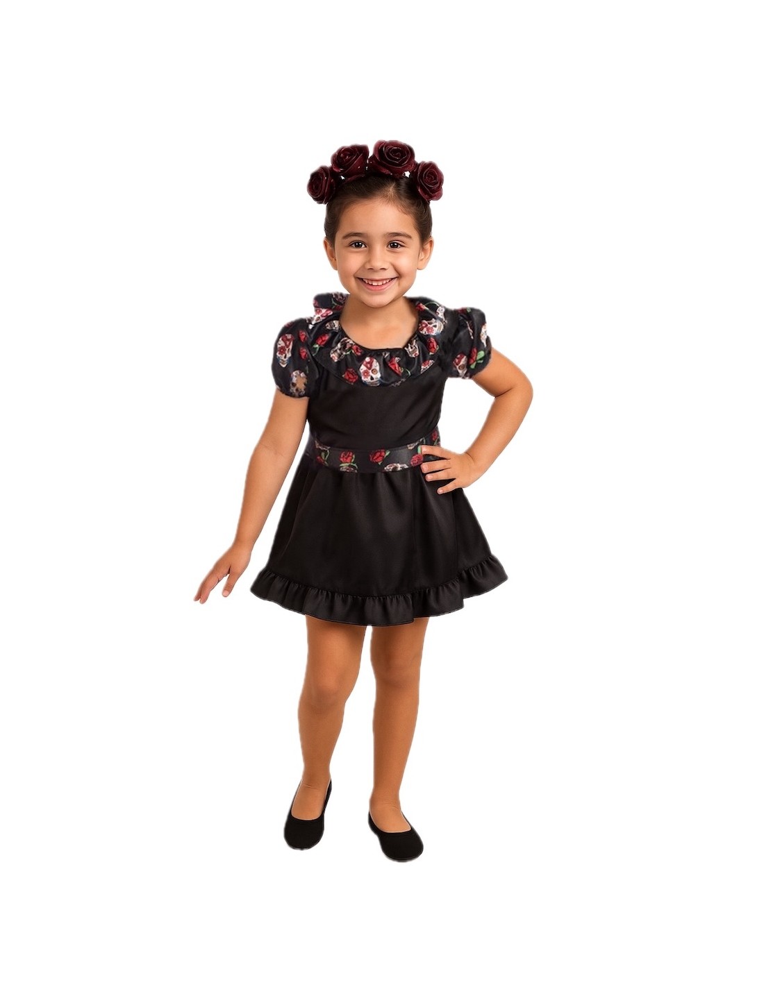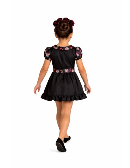 Costume élégant et original avec une robe en jersey de machine semi-élastique, décorée d'os peints (non fluorescents). Fermeture velcro à l'arrière du cou pour un meilleur confort. Col et manches en satin avec un délicat imprimé floral et de crânes, jupe en satin avec volants et volants en bas. La taille et les manches ont des élastiques pour un ajustement parfait. La ceinture est confectionnée sur une pièce de TNT pour donner du corps et de la structure au vêtement. Un ensemble léger avec des détails soignés pour briller avec style et tradition.