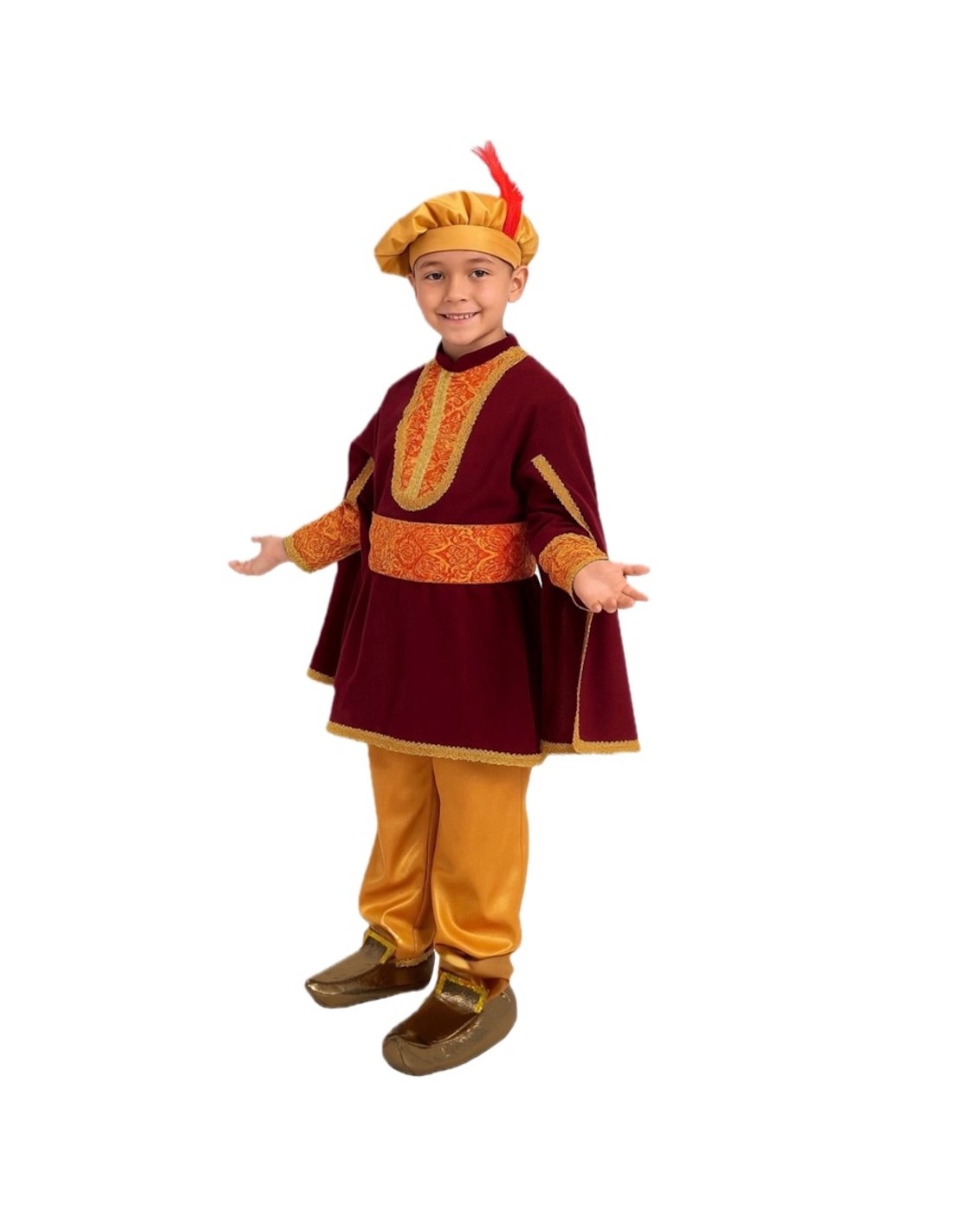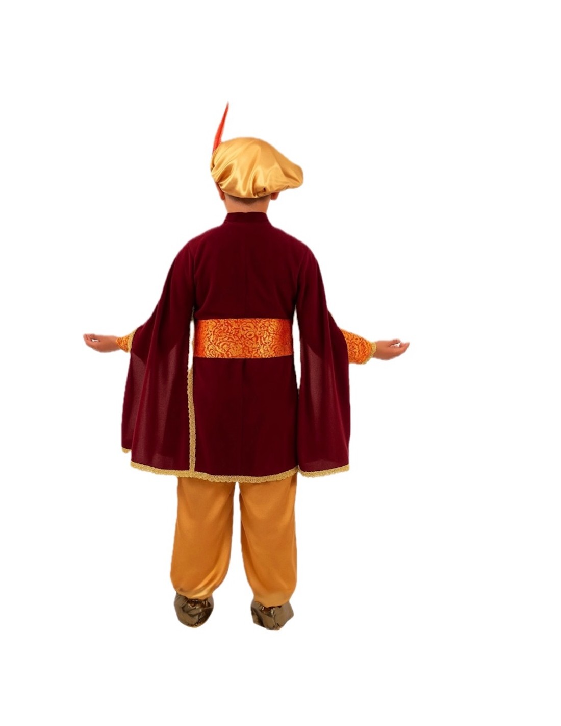 Veste en tissu au toucher velouté combiné avec du satin imprimé sur la poitrine et les manches, avec des ornements de passementerie dorés. Les manches, en forme de cape, offrent une meilleure couverture et une allure plus princière. De même, les babouches sont décorées de paillettes et le bonnet est orné d'une plume rouge intégrée. Il est livré avec une ceinture qui se ferme et s'ajuste avec une fermeture velcro, ainsi qu'un pantalon doré avec une taille élastique et une petite poche interne.