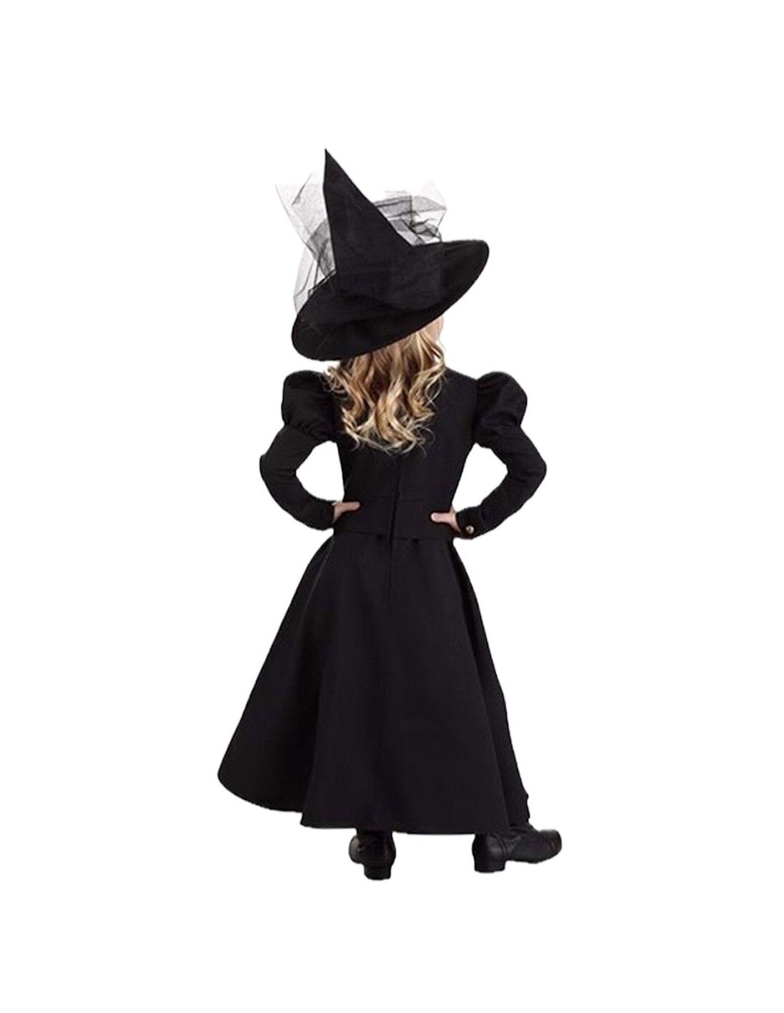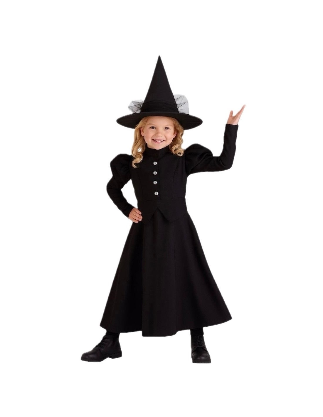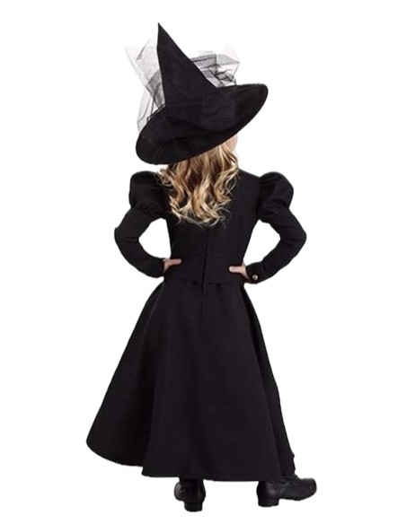 Un ensemble qui allie mystère et distinction. La robe, confectionnée en polyester doux et dense, présente une coupe longue avec une taille élastique qui s'adapte confortablement. Ses manches ballon et les boutons décoratifs sur le devant apportent une touche classique, tandis que le col montant et la fermeture velcro dans le dos assurent une finition impeccable. L'ensemble est complété par un chapeau en satin résistant, avec un cercle interne maintenant sa forme et du tulle noir tombant jusqu'à la taille. Sa pointe légèrement courbée ajoute une touche gracieuse et unique, idéale pour des fêtes à thème ou d'Halloween.