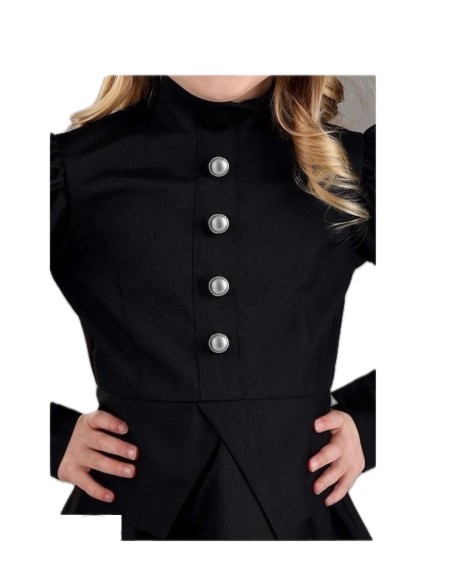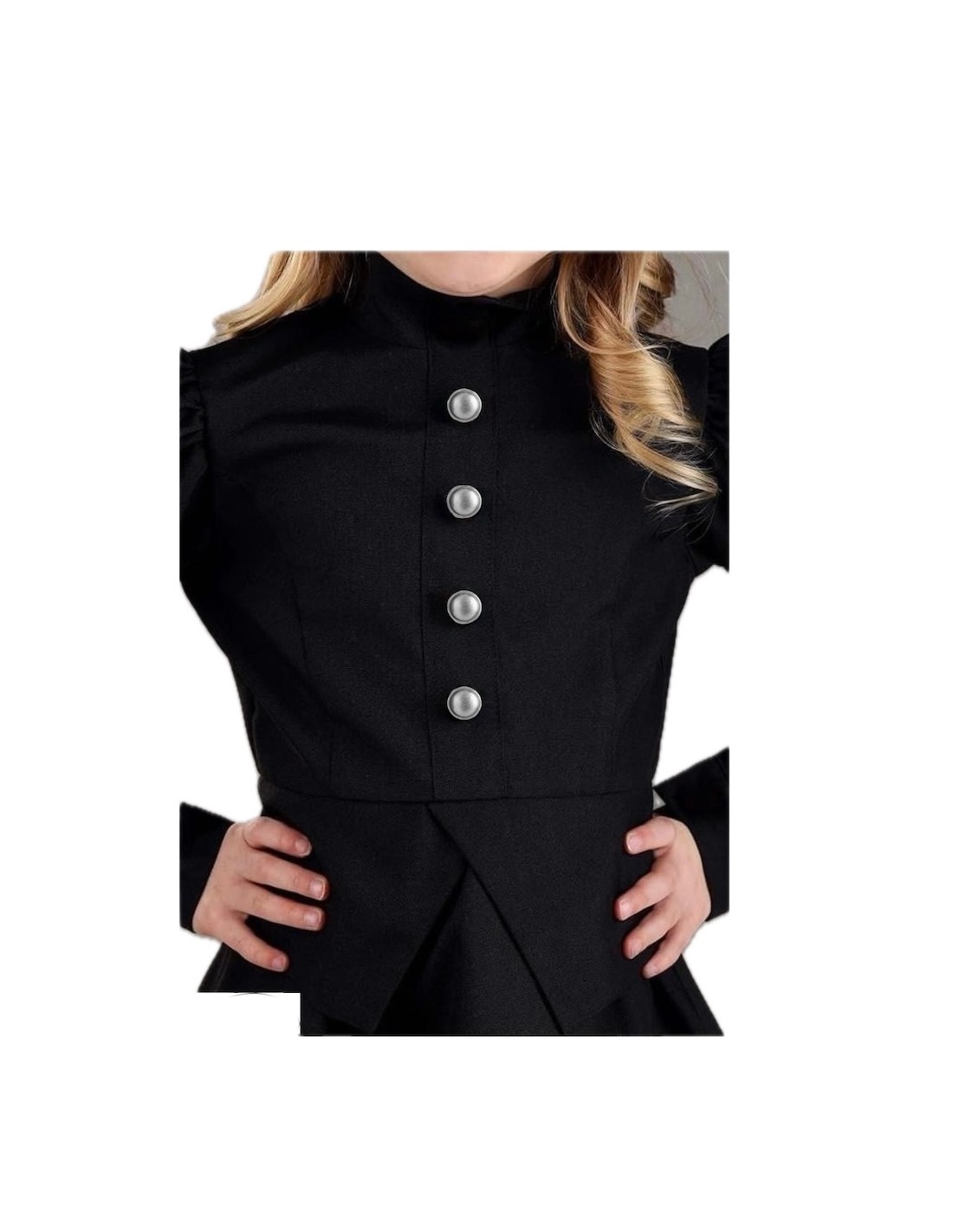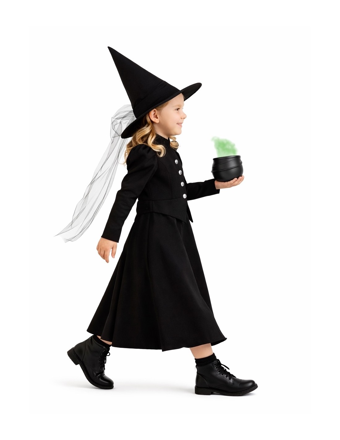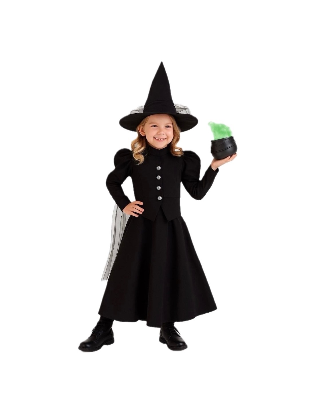 Un ensemble qui allie mystère et distinction. La robe, confectionnée en polyester doux et dense, présente une coupe longue avec une taille élastique qui s'adapte confortablement. Ses manches ballon et les boutons décoratifs sur le devant apportent une touche classique, tandis que le col montant et la fermeture velcro dans le dos assurent une finition impeccable. L'ensemble est complété par un chapeau en satin résistant, avec un cercle interne maintenant sa forme et du tulle noir tombant jusqu'à la taille. Sa pointe légèrement courbée ajoute une touche gracieuse et unique, idéale pour des fêtes à thème ou d'Halloween.
