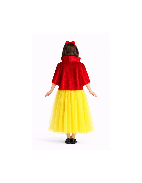 Les manches bouffantes en satin et le col ébouriffé avec structure créent une silhouette emblématique et soignée. Sur les épaules, il intègre une cape en velours rouge qui descend jusqu'à la taille, ajoutant une touche distinguée.