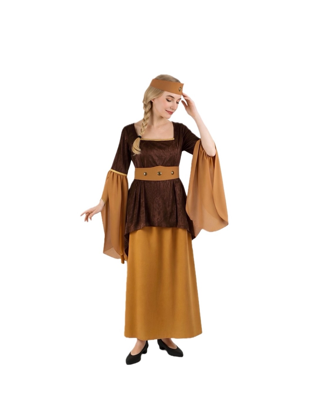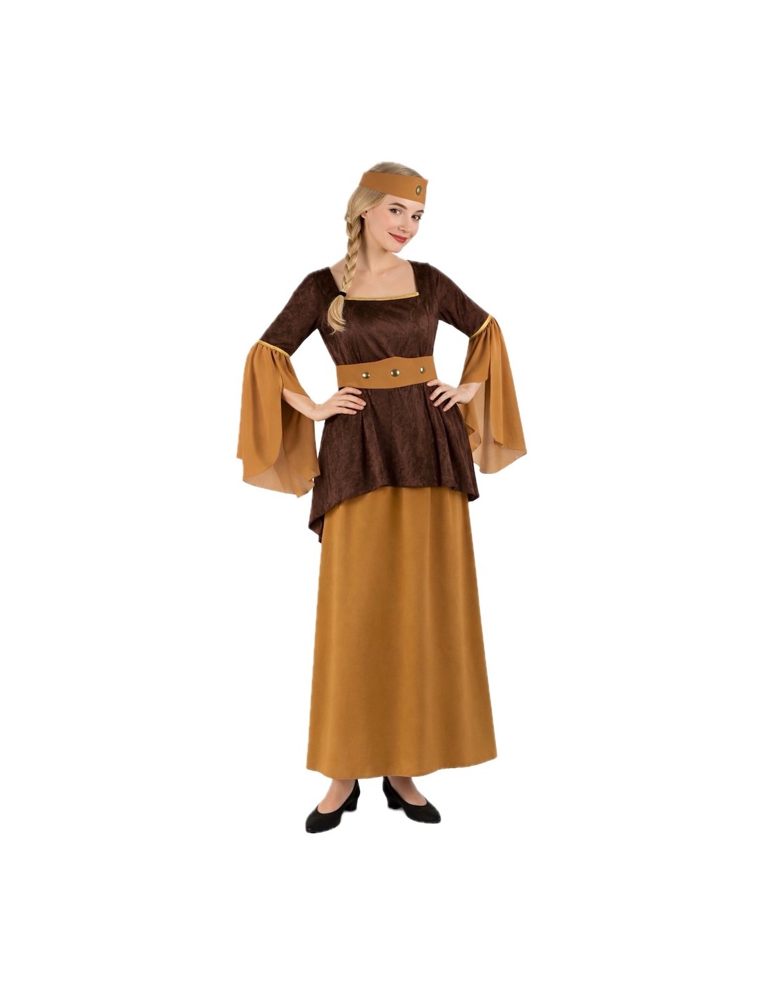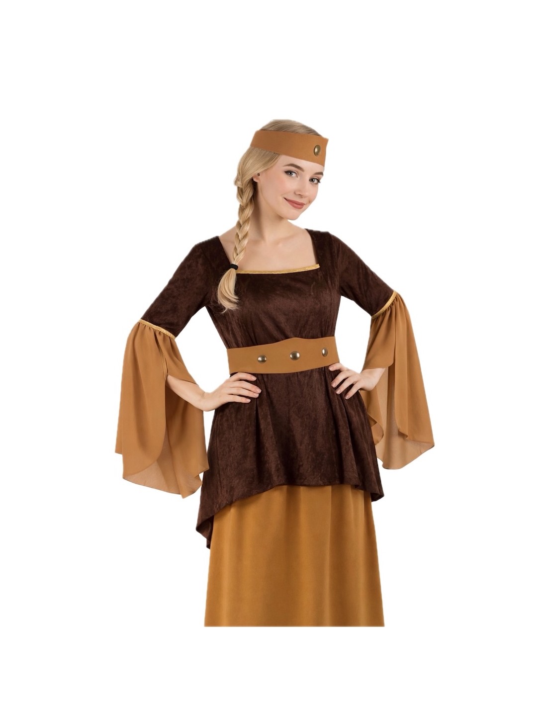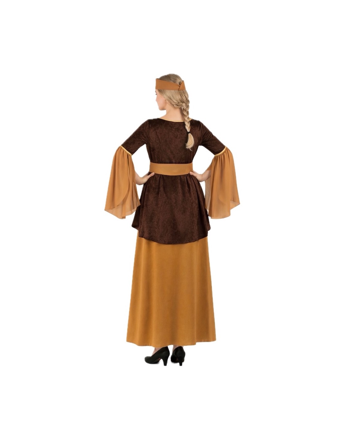 Ce costume médiéval élégant, confectionné en velours doux et en tissu au toucher peau de pêche, se compose d'une veste longue avec un décolleté carré décoré de galons dorés. Les manches, typiques de l'époque médiévale, s'ouvrent à partir du coude et sont également ornées de galons. La partie inférieure du costume se compose d'une longue jupe avec une taille élastique pour un ajustement optimal et une petite poche interne. L'ensemble est complété par une ceinture rembourrée décorée de pièces simulant le bronze et d'un nœud en velours dans le dos. Enfin, un turban rembourré est inclus avec le même ornement que la ceinture, qui présente un petit élastique à l'arrière pour une meilleure adaptation à la tête.