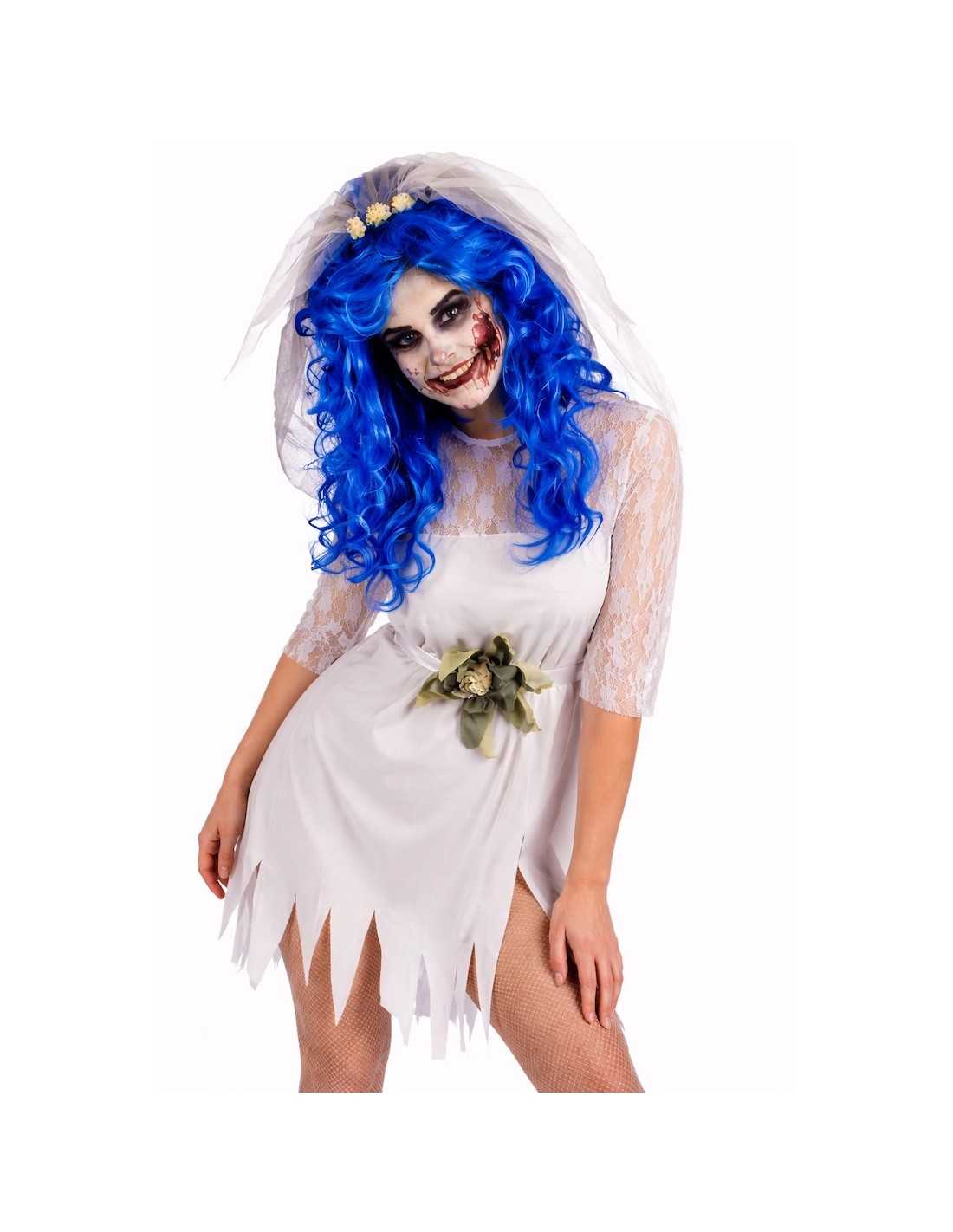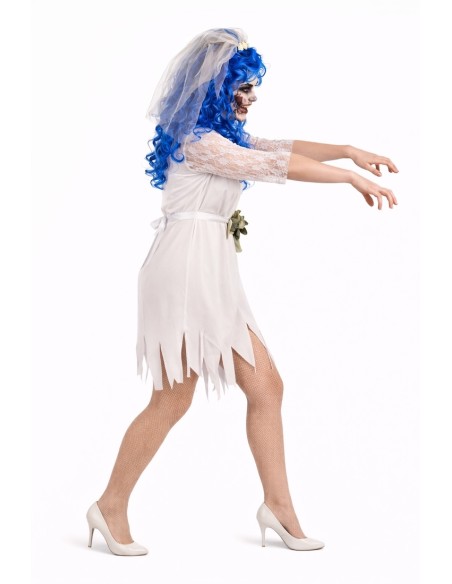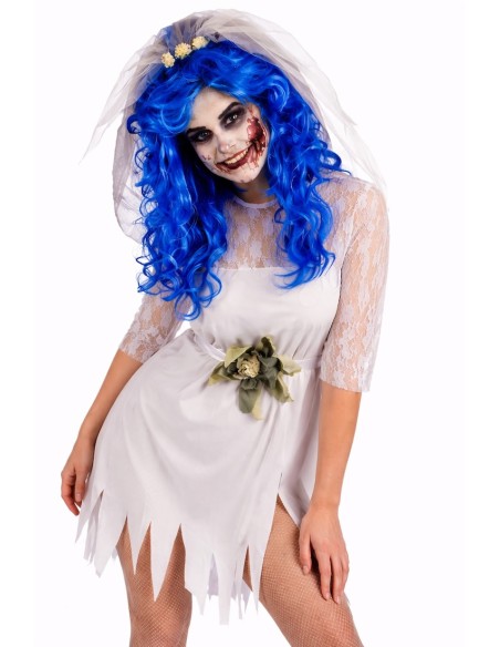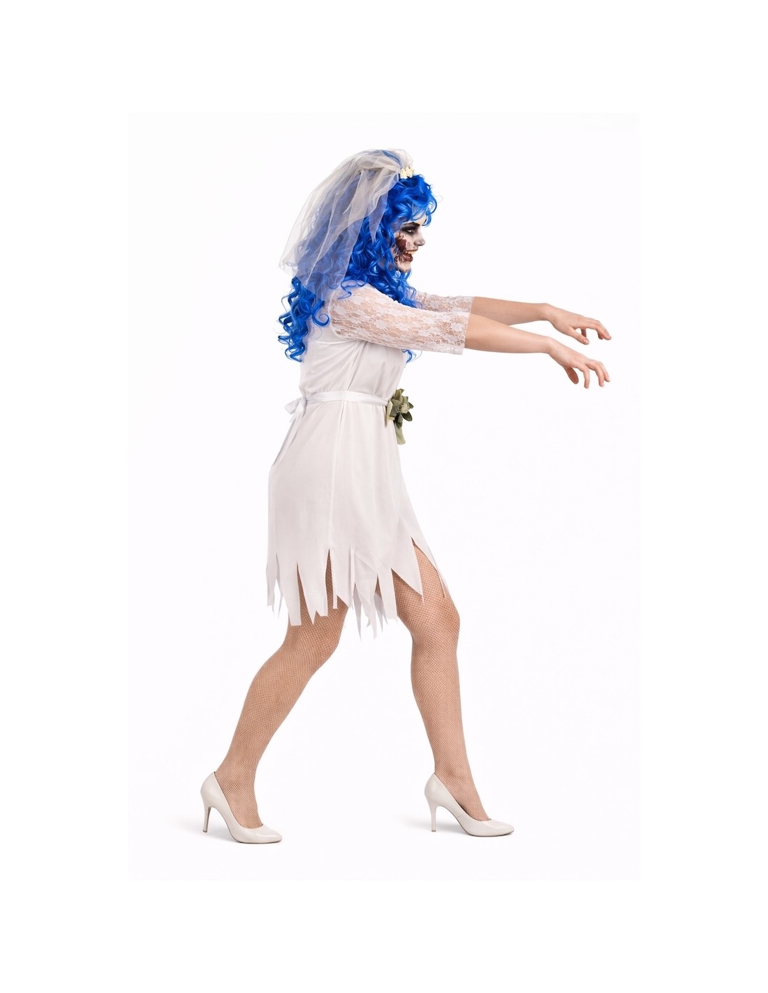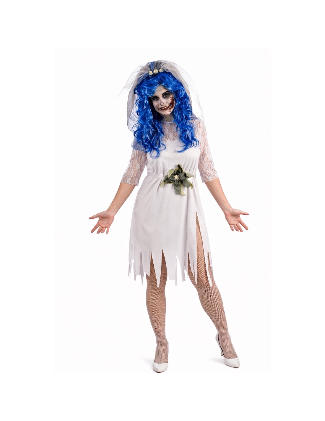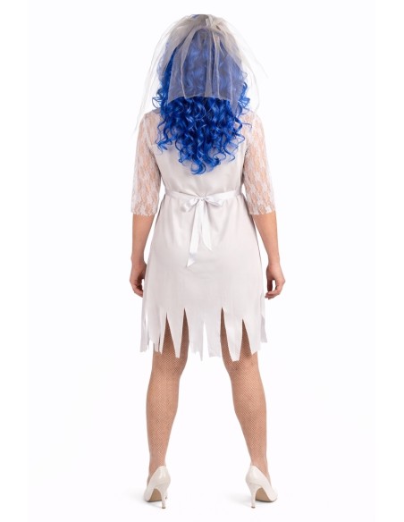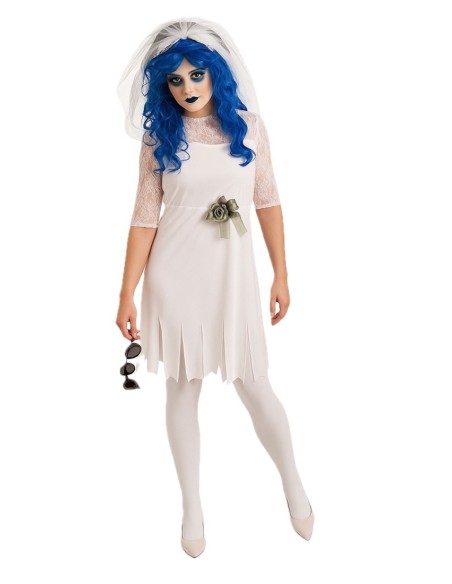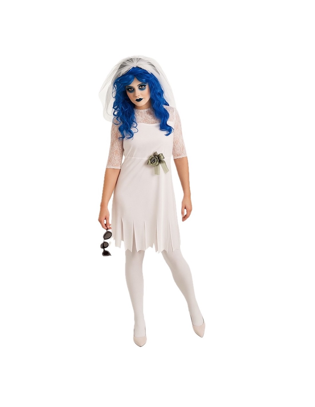 Robe confectionnée en jersey semi-élastique et en dentelle douce, de style guipure sur la poitrine et les manches. La fermeture se trouve à l'arrière avec un nœud au cou. La tenue est complétée par une ceinture ornée de tissu, imitant une fleur fanée, et une coiffe pour les cheveux, sous la forme d'un serre-tête avec de petites fleurs et des lambeaux évoquant le voile caractéristique de la mariée cadavérique.