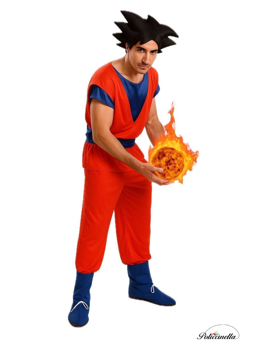 Ce costume attrayant, aux couleurs vives, est confectionné dans un tissu de machine semi-élastique doux et dense. Il est orné sur la poitrine, les manches et la ceinture d'applications en satin bleu métallique. En bas, il comporte un pantalon en tissu de machine doux avec une taille élastique et une petite poche intérieure. Pour compléter le tout, il est accompagné de couvre-bottes et d'un bonnet/perruque fabriqués en satin mousseux et en tissu TNT.