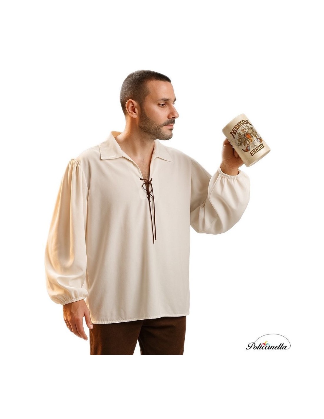 Cette chemise / veste médiévale attrayante, de couleur blanc cassé, est fabriquée en polyester résistant mais doux et présente une coupe droite. Le col, de type chemise, se ferme avec un cordon, comme c'était caractéristique à l'époque médiévale. Les manches sont ajustées avec un élastique au poignet.