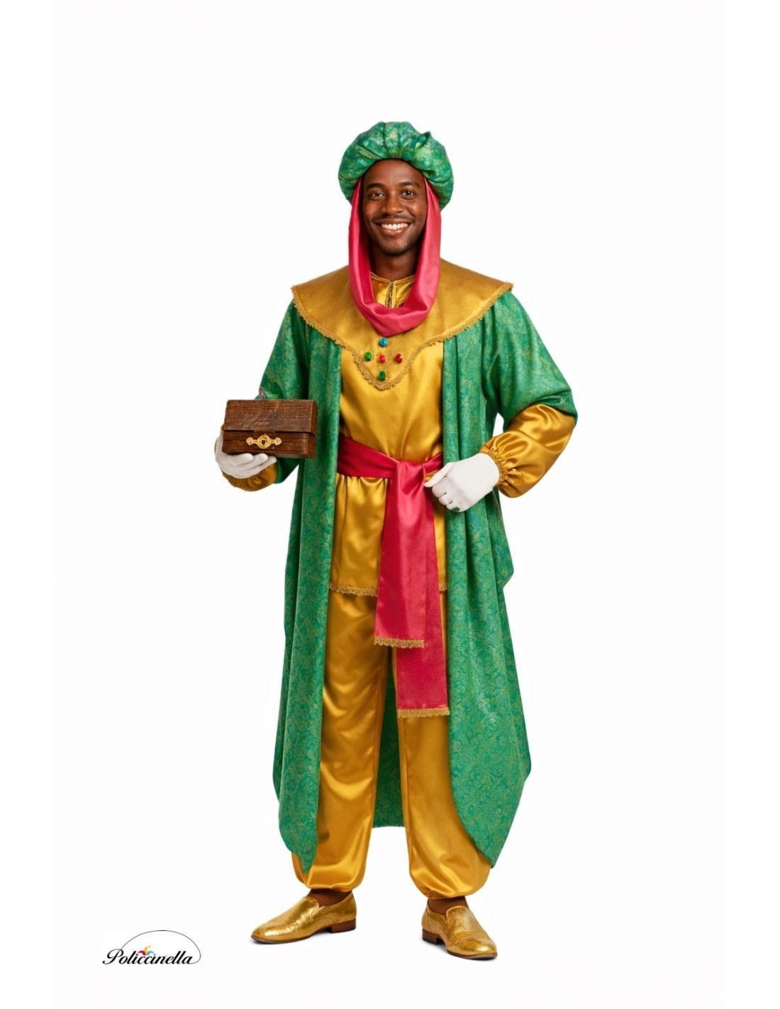 Ce majestueux costume du Roi Balthazar comprend un t-shirt en polyester avec fermeture Velcro au cou et une décoration sur la poitrine faite de TNT, ornée de strass et de galons. Le pantalon, du même tissu et de la même couleur, a une taille élastique et une poche intérieure. Par-dessus, il porte une cape en brocart de type damas, avec un imprimé argenté à l'extérieur et doré à l'intérieur, froncée aux épaules et avec des ouvertures pour les bras. L'ensemble est complété par des babouches en satin doré floqué de paillettes sur le revers, un turban du même tissu que la cape avec un voile en satin, et une ceinture assortie au voile. "L'imprimé du tissu peut légèrement varier par rapport à celui montré sur la photo, en conservant toujours la même qualité et le même style."