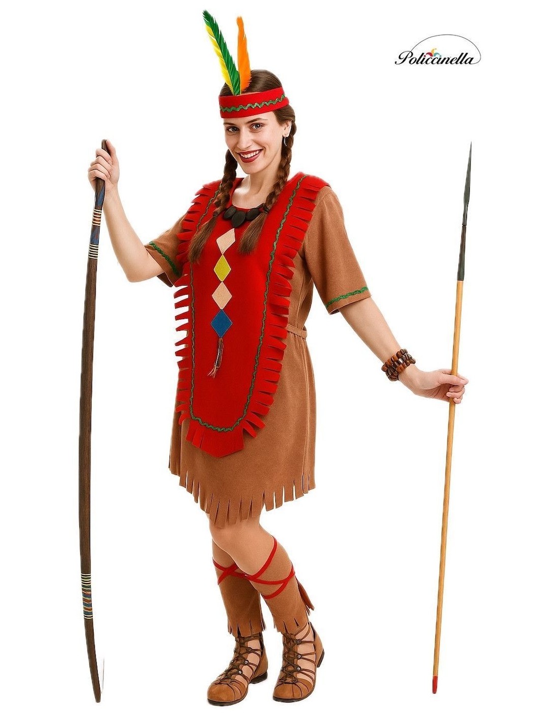 Ce joli déguisement d'indienne, confectionné en polyester doux au toucher velouté, se compose d'une robe avec un corsage d'un rouge vif qui descend presque jusqu'au bas de la robe. La robe est décorée avec les franges typiques et les couleurs caractéristiques du personnage. La manche est courte et est décorée, tout comme la robe, avec une bande de picota ondulée en vert. Le déguisement se ferme à l'arrière au niveau du cou avec du velcro. Il est complété par des chauffe-jambes avec des lacets rouges du même tissu que le reste du costume et un ruban avec trois plumes de couleurs vives, avec un élastique à l'arrière pour ajuster à la tête.