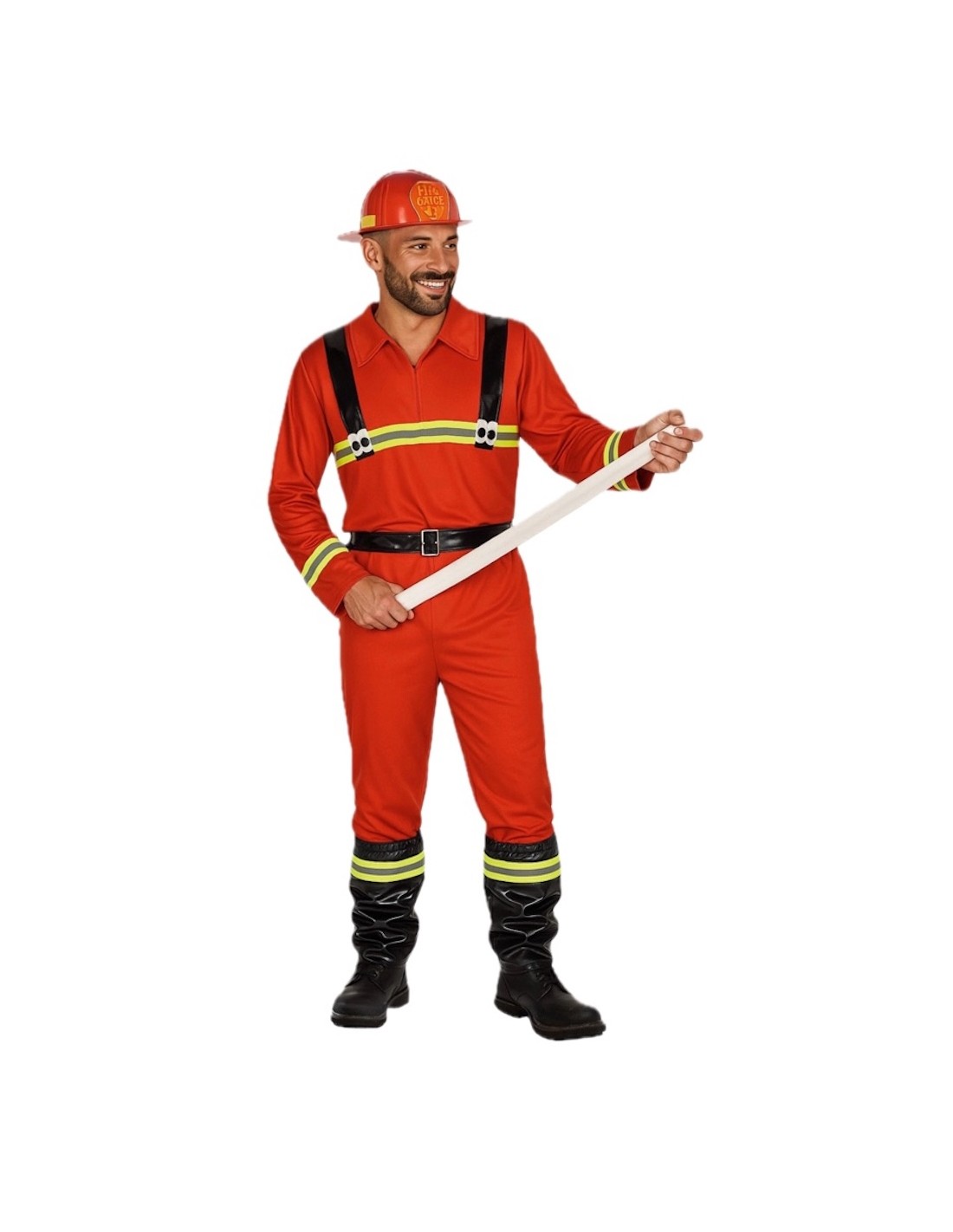 Ce costume complet de pompier, confectionné en maille semi-élastique à la machine, se compose d'un t-shirt long avec l'élément réfléchissant typique (non fluorescent dans l'obscurité) et de bretelles en polyester brillant. En bas, il y a un pantalon du même tissu que le t-shirt, avec une petite poche intérieure. Il est complété par des couvre-bottes fabriqués dans le même matériau, sur le devant de la tenue. Et en guise de complément, le costume comprend une ceinture avec un tuyau du même matériau, qui peut être porté ou accroché.
