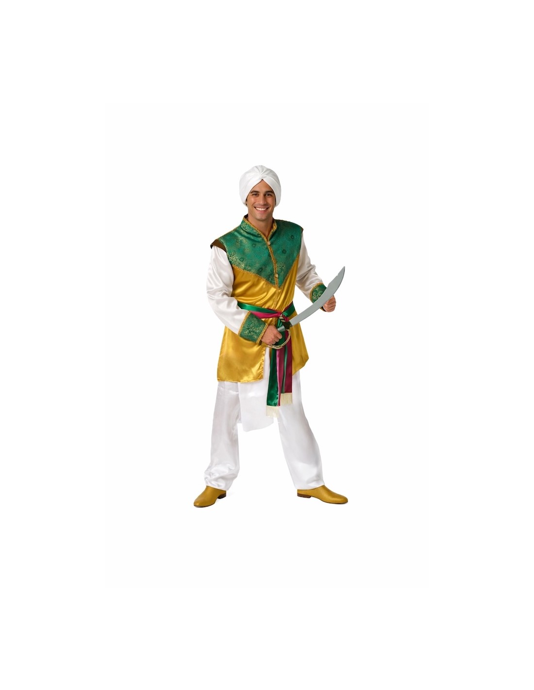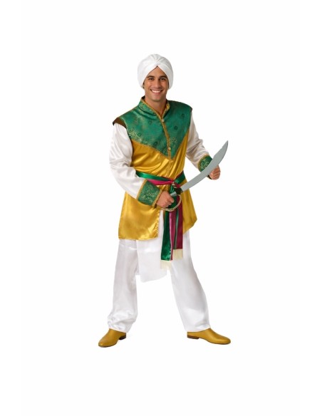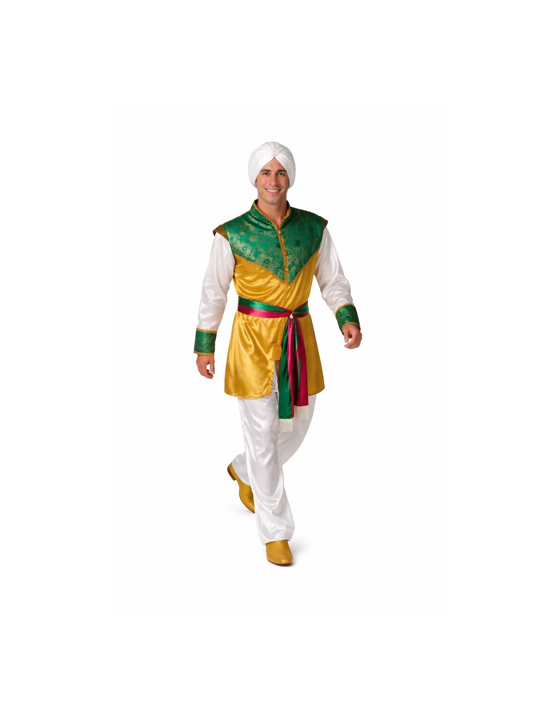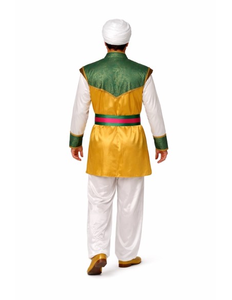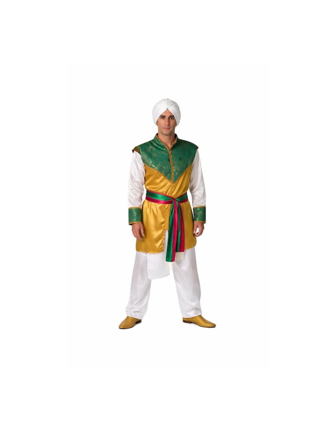 Déguisement hindou de haute qualité composé d'une chemise en satin doré avec un panneau frontal en tissu brocart vert, rehaussée de galons dorés et de boutons fonctionnels. Les poignets s'accordent avec le brocart frontal, et les épaulettes intérieures apportent de la structure. Le pantalon en satin intègre une pièce supplémentaire simulant le traditionnel dhoti. Comprend une ceinture décorative en satin fuchsia et vert avec des franges, ainsi qu'un turban assorti en satin. Idéal pour des représentations culturelles, des événements à thème ou des fêtes costumées.