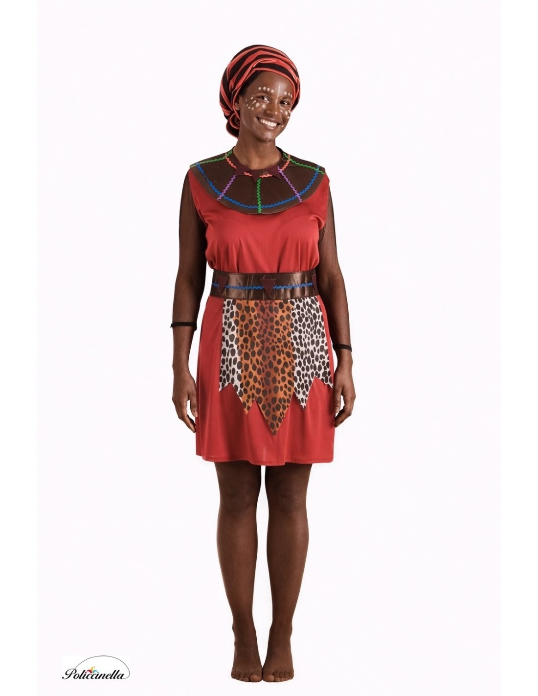 Élégante robe confectionnée en doux jersey semi-extensible, avec fermeture par velcro au cou et manches en mousseline semi-transparente apportant de la légèreté. Son col de type collier tribal se démarque, fabriqué en polyester mousse pour donner du volume, décoré de vagues de couleurs et de pièces de feutre cousues, avec fermeture velcro à l'arrière. L'ensemble est complété par une ceinture assortie, à partir de laquelle part un tablier décoratif à imprimé animalier en guise de cache-sexe. Idéal pour des représentations culturelles, des événements scolaires ou thématiques. Authentique et accrocheur!