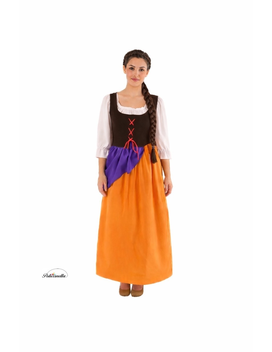 Déguisement de paysanne composé d'une blouse et d'un gilet intégrés en une seule pièce pour plus de confort. La blouse, en tissu blanc en tricot machine, présente des manches avec du caoutchouc au coude et des finitions en dentelle, tout comme le col. Le gilet marron, en polyester type pêche, est orné de rubans rouges en zigzag simulant une fermeture et d'un élastique à l'arrière pour un meilleur ajustement. La jupe, en tricot orange, est dotée d'un élastique à la taille et d'un tablier violet intégré en polyester dense. Le tout est complété par un bonnet élastique bordé de rouge. Un design pratique, léger et visuellement fidèle à l'esthétique traditionnelle.