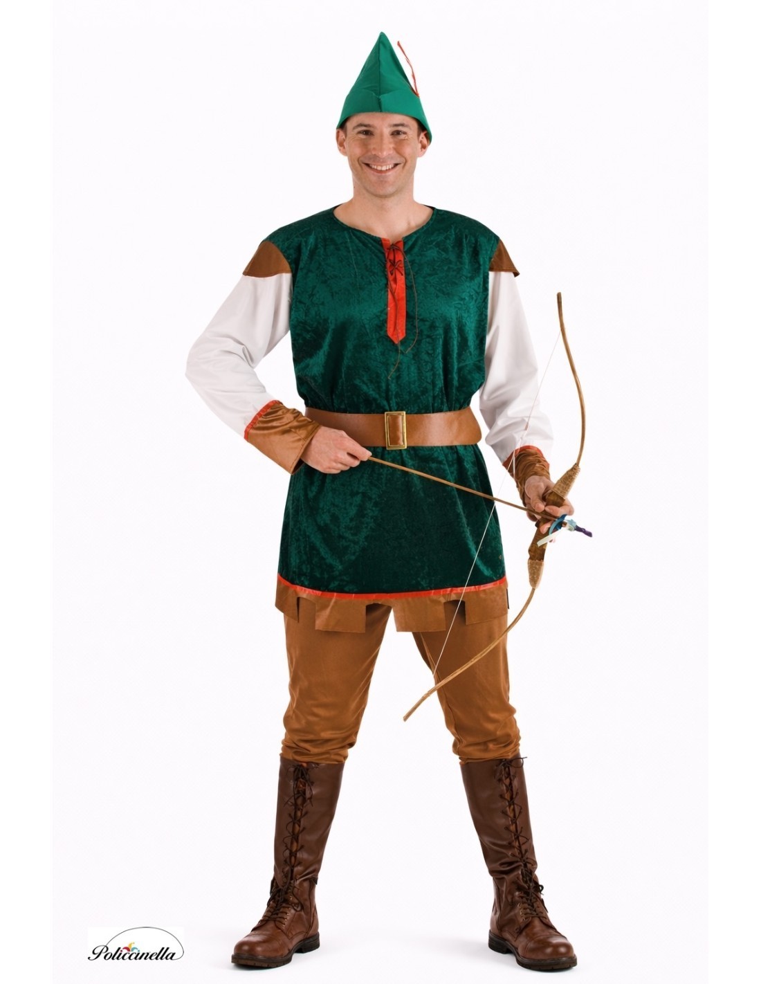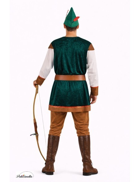 Veste confectionnée en velours doux, avec un col en dense toile et des lacets similaires au cuir sur le devant pour la fermeture. Elle intègre des épaulettes extérieures tissées sur de la toile pour plus de rigidité, tout comme le bas de la veste. Le dos est fait de maille semi-élastique douce pour plus de légèreté et de liberté de mouvement. Les manches sont en polyester doux. Le pantalon, confectionné en maille semi-élastique douce, présente une petite poche interne. La ceinture, en polyester tissé sur de la toile avec un aspect cuir, est dotée d'une boucle en plastique imitant le métal. Enfin, le chapeau caractéristique du personnage est inclus, confectionné en dense toile avec une plume latérale comme décoration.