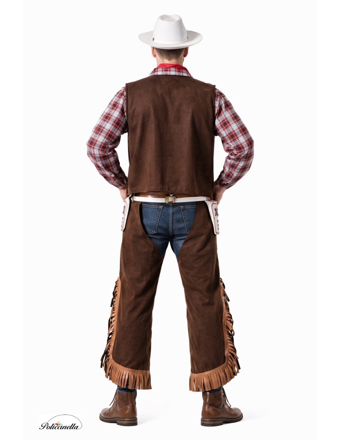 Déguisement western classique avec chemise en polyester au toucher similaire à du linge de table et gilet intégré simulant deux pièces. Le gilet combine du polyester pelucheux et doux avec une maille imitant le cuir rouge, avec des franges renforcées pour plus de poids et de forme. Il comprend une ceinture en caoutchouc et velcro, d'où partent deux cartouchières à franges, également en polyester pelucheux et décorées de pièces en plastique semblant métalliques. L'ensemble est complété par un foulard en maille douce à nouer autour du cou. Confection soignée et tissus confortables avec une finition de qualité.