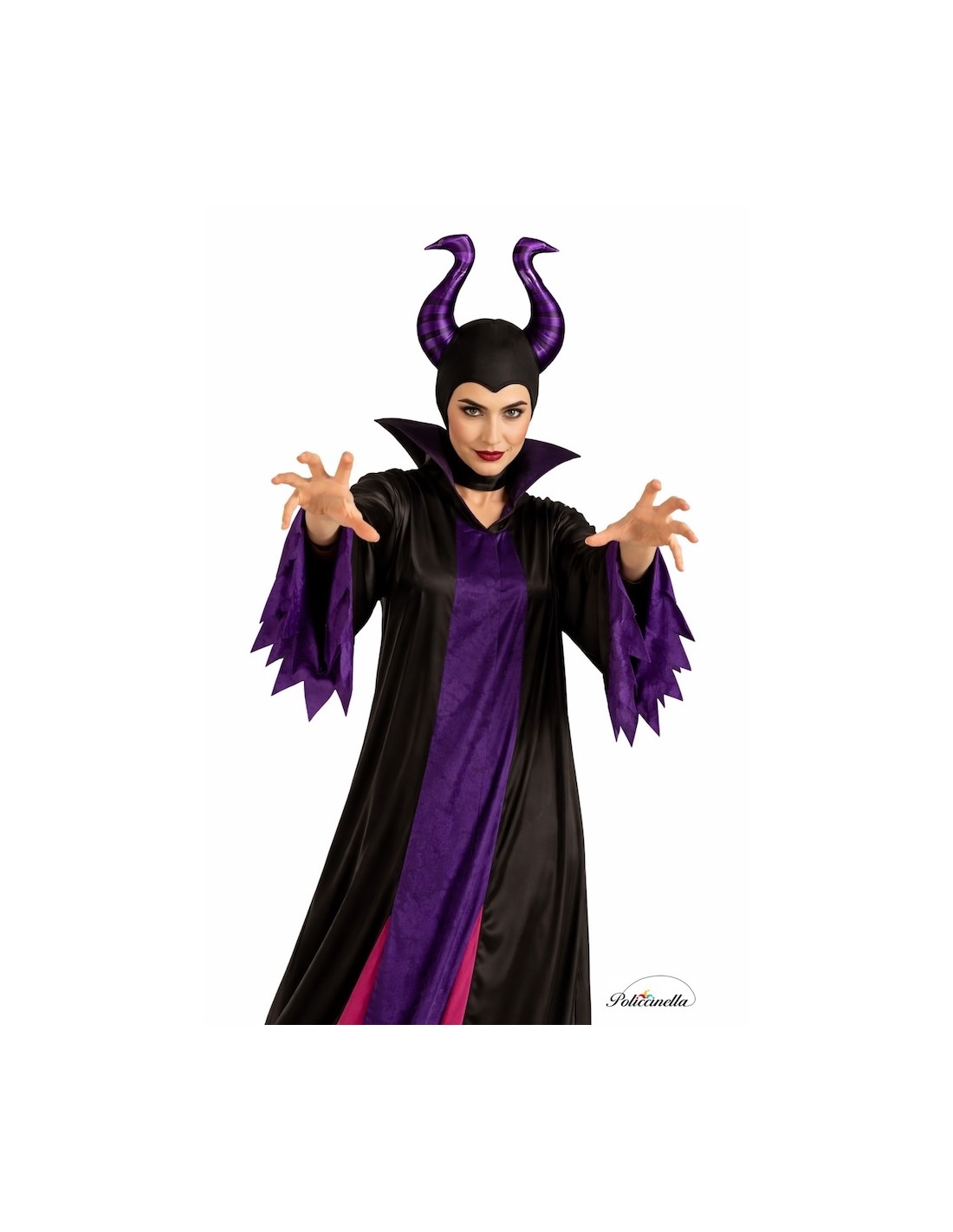 Ce costume de reine maléfique comprend une longue robe noire en satin, avec des manches larges légèrement évasées qui incluent des détails en velours sur une base en mousse. Au centre, un panneau pourpre, du même tissu que les manches, s'étend du col jusqu'en bas. De chaque côté du bas, il y a des détails en rose fraise du même matériau que le panneau central. Le col, en satin matelassé, pour assurer sa structure, se ferme avec du velcro à l'arrière pour un ajustement confortable. Il comprend un chapeau noir en satin matelassé, avec les cornes caractéristiques du personnage, remplies de mousse pour maintenir leur forme et avec de l'élastique à l'arrière pour un meilleur ajustement.