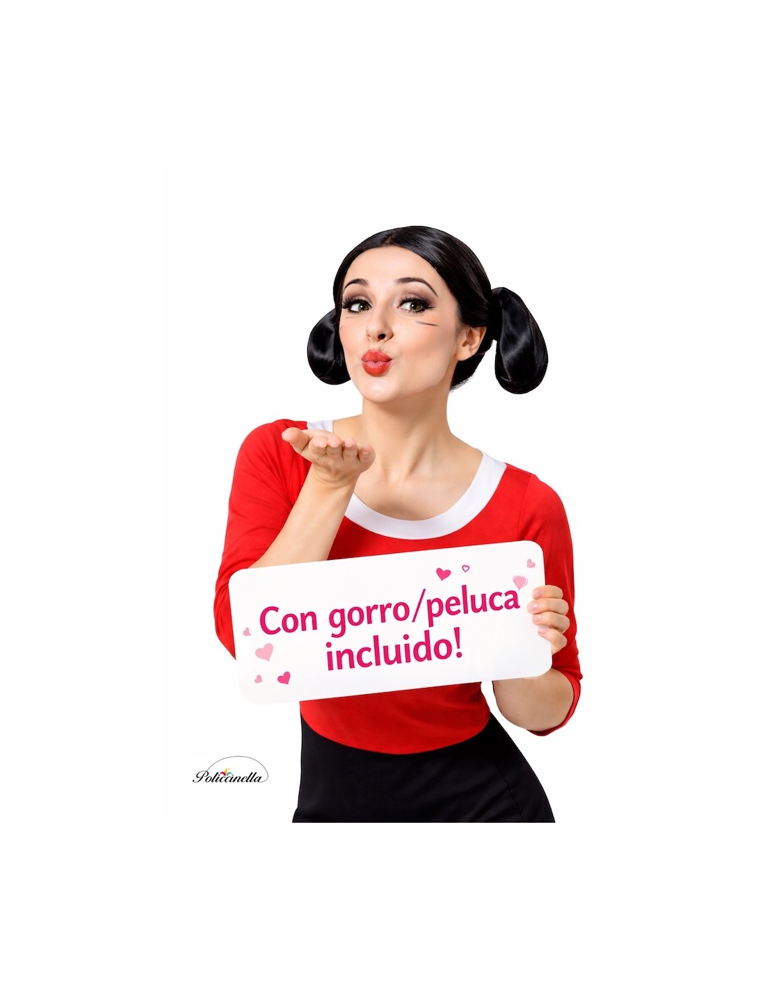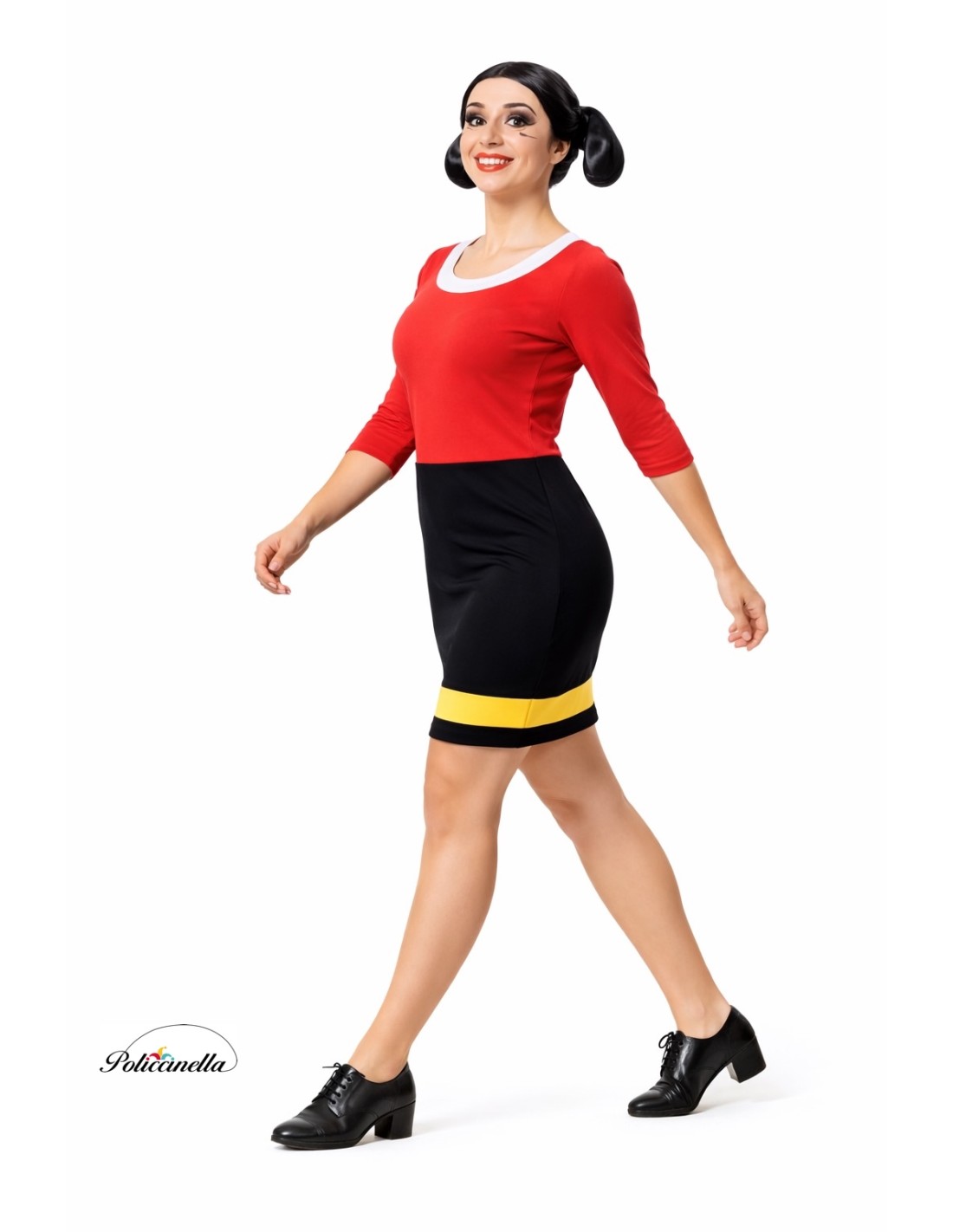Le déguisement, comprenant un chapeau/perruque, est composé d'une robe confectionnée en doux jersey semi-extensible. La robe présente une coupe droite et une fermeture au cou à l'arrière avec du velcro. Le col, fabriqué en doux polyester, est rembourré pour offrir plus de structure et de forme. Le bas de la jupe est décoré à l'avant avec une bande de couleur jaune. Le déguisement comprend également le chapeau/perruque, confectionné en polyester mousse pour préserver sa forme caractéristique.