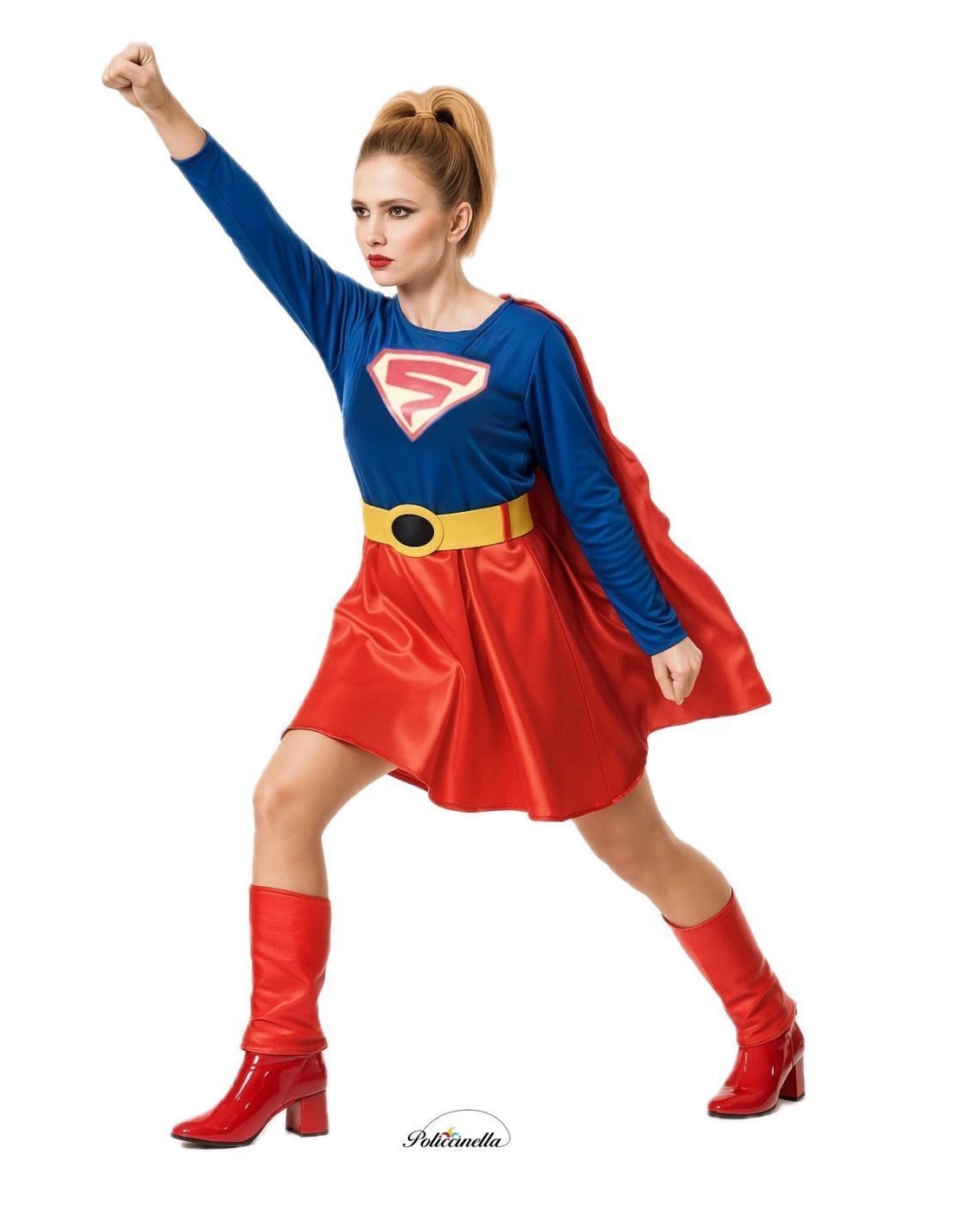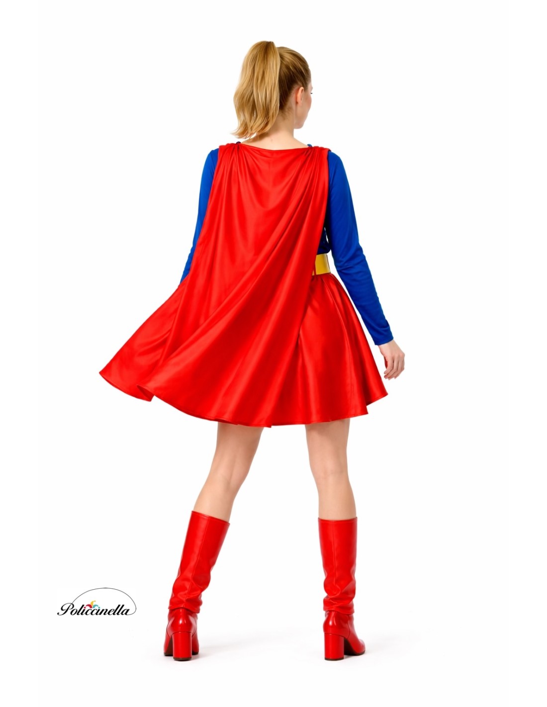 Ce costume classique et élégant se compose d'une robe confectionnée en doux tricot semi-élastique avec fermeture au cou à l'arrière. La partie supérieure est faite de ce matériau, tandis que la jupe est confectionnée en doux et dense satin. À la taille, il y a un élastique et la jupe est plissée pour plus de volume et de mouvement. À partir des épaules, une cape en tricot machine est attachée par du velcro. Le costume comprend également une ceinture en polyester rembourré avec fermeture dans le dos par système de velcro et des chauffe-jambes en satin rembourré pour maintenir sa forme et sa structure, simulatnt la partie haute des bottes.