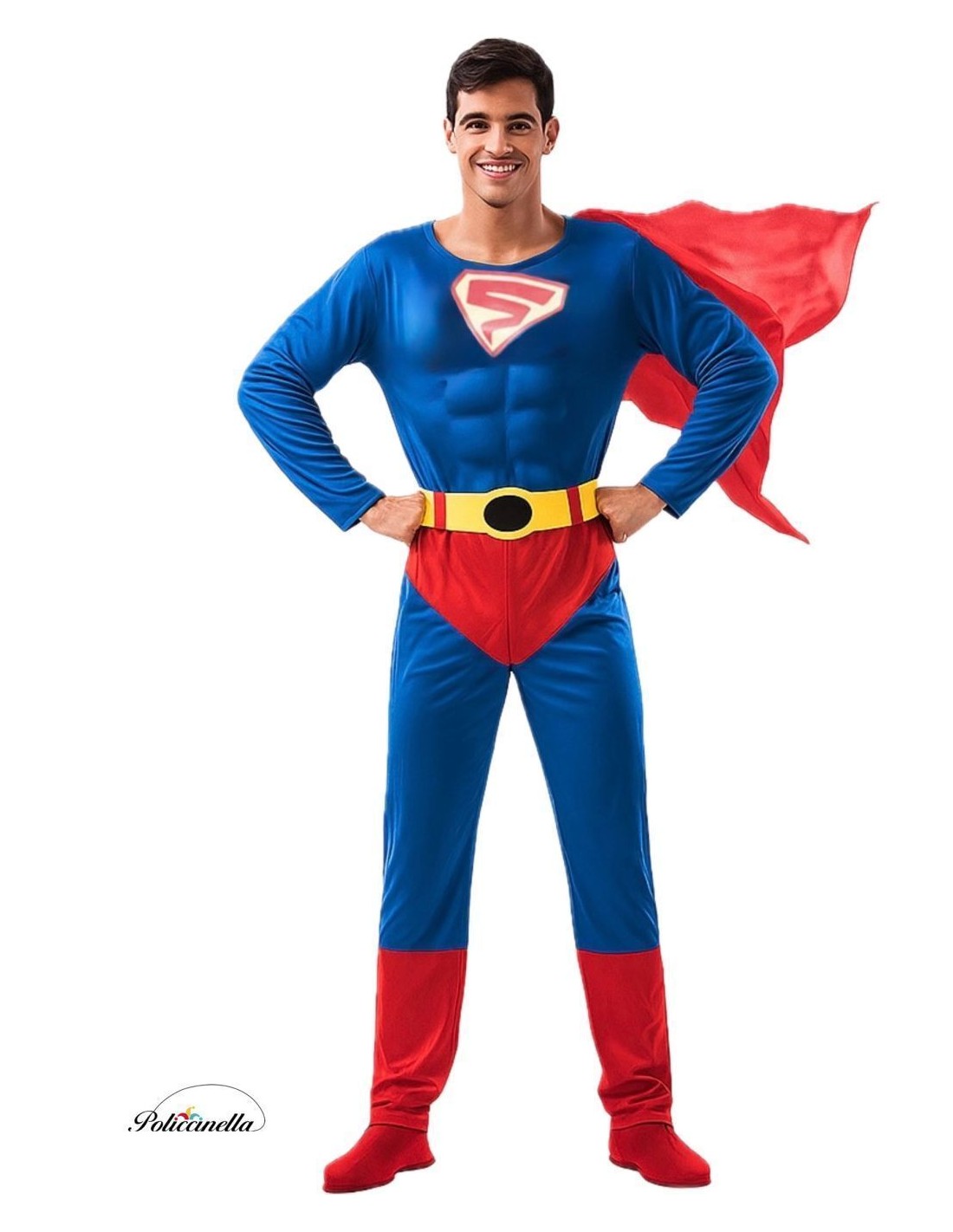 Ce costume de super-héros se compose d'une combinaison intégrale fabriquée en doux jersey de machine. Il comprend une section frontale simulant des abdominaux, rembourrée de fibre de polyester pour du volume et du réalisme. Le bas du pantalon, en rouge, et le caleçon, tous deux fabriqués dans le même tissu que la combinaison, comprennent une braguette fermée par une fermeture éclair cachée pour plus de confort. Ajoutez une cape, du même tissu que la combinaison, attachée avec du velcro. Un ceinturon en jersey de machine jaune, rembourré, avec un design caractéristique, se ferme avec du velcro à l'arrière. La combinaison se ferme à l'arrière avec une fermeture éclair cachée.