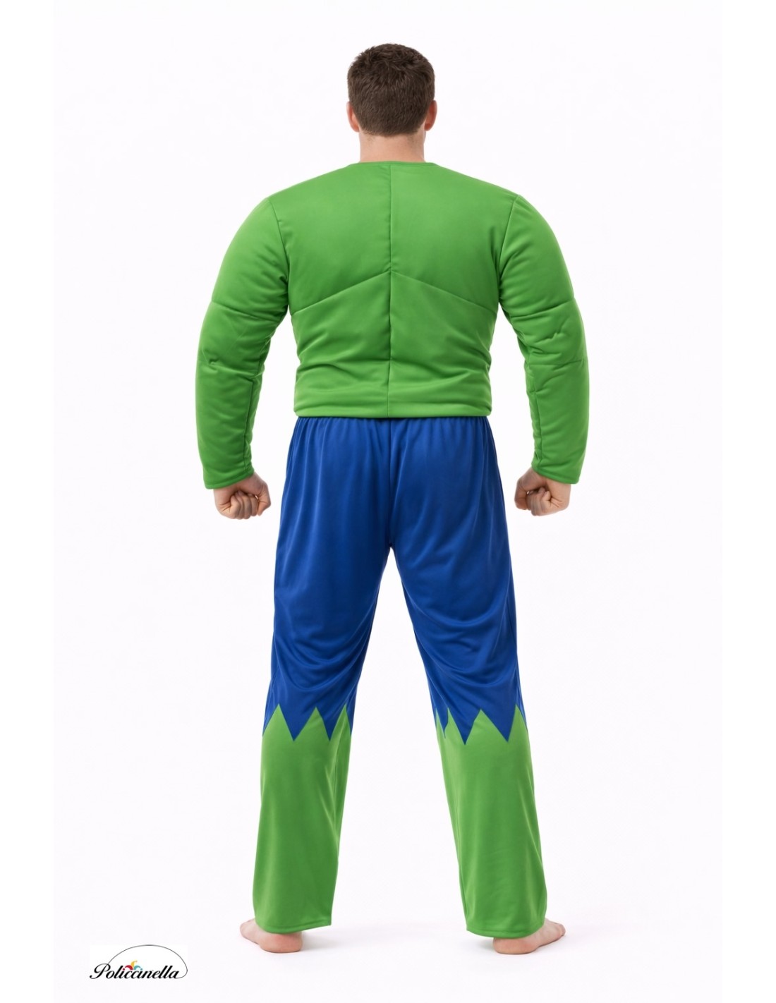 Ce costume, de qualité excellente, se compose de deux pièces : le t-shirt, fabriqué en doux tricot semi-élastique, présente un rembourrage léger mais dense sur le devant et les bras pour imiter la musculature du personnage. Les muscles intérieurs sont recouverts d'un filtre doux pour plus de confort. Le t-shirt se ferme à l'arrière du cou avec du velcro. Le pantalon, fabriqué dans le même tissu confortable que le t-shirt, a une taille élastique et une petite poche intérieure. Le bas du pantalon est de la même couleur verte fluo que le t-shirt pour harmoniser l'ensemble.
