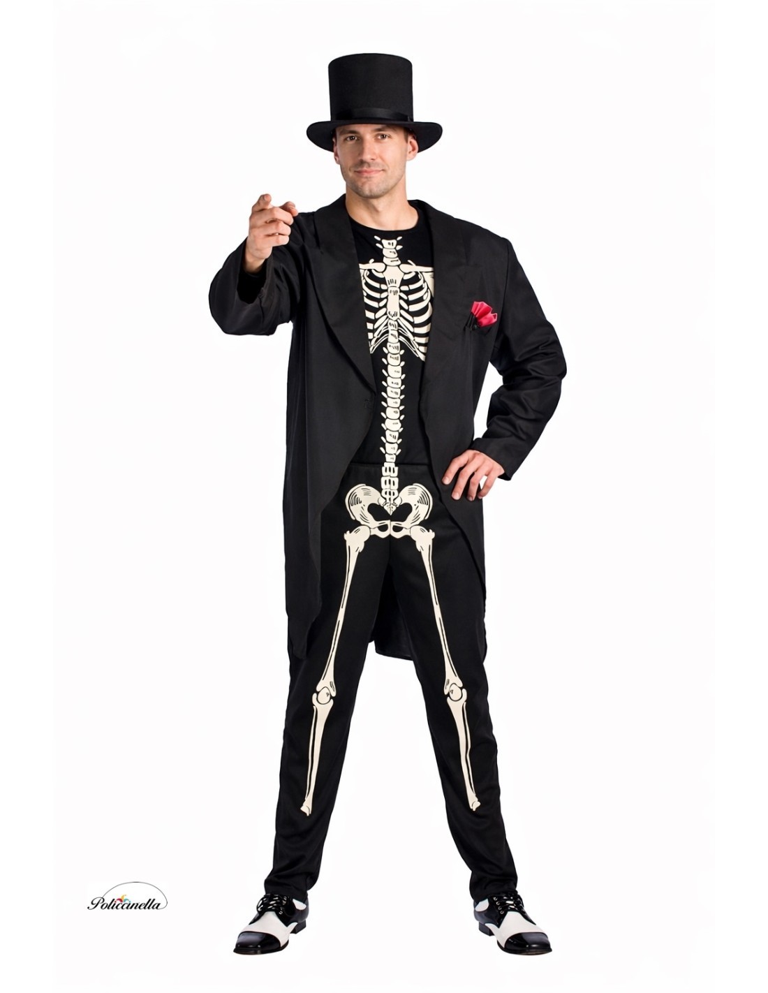 Combi-short confeccioné dans un doux tricot semi-élastique avec fermeture à glissière invisible dans le dos et fermeture à glissière invisible à l'entrejambe pour plus de confort. La combi-short présente un squelette imprimé sur le tissu lui-même (non fluorescent) et est sans manches. Elle est accompagnée d'une veste longue de style redingote, avec une fausse poche avant décorée d'un élément fuchsia, fabriquée en polyester dense. La veste se ferme à l'avant avec du velcro. L'ensemble est complété par un bonnet en tricot machiné pour maintenir sa structure et éviter les déformations. De plus, bien que cela ne soit pas visible sur la photo, une ceinture imprimée de caravelles est incluse, ajustable avec un système de velcro, qui peut être portée avec le costume ou non.