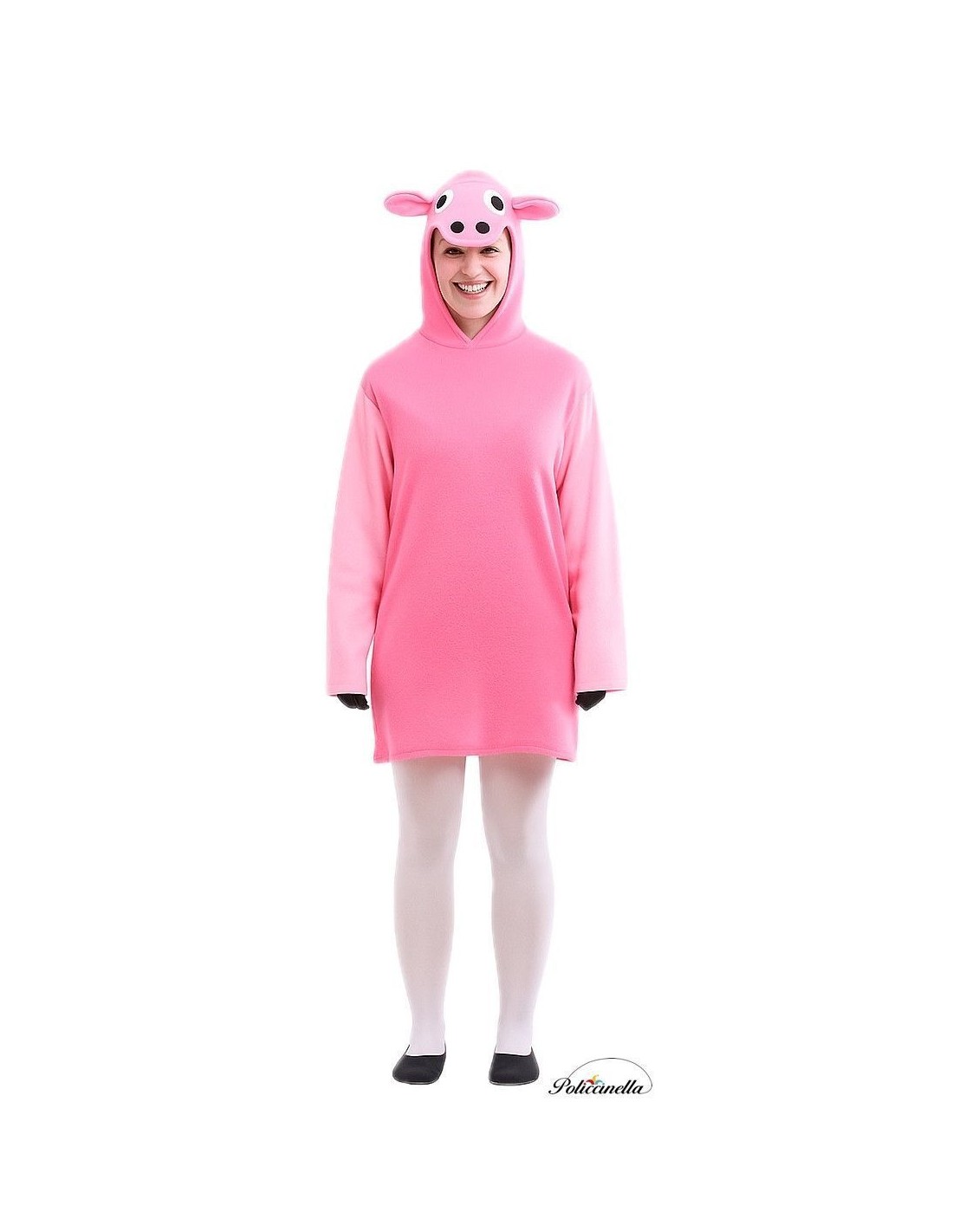 Superbe costume de petite cochonne avec une robe confectionnée en polyester peluche, ultra doux et câlin, avec une fermeture velcro à l'arrière du cou et une capuche intégrée. La capuche, du même matériau, est renforcée pour maintenir sa forme et éviter les déformations, décorée d'yeux et d'un nez en feutre dense collés au tissu. Léger, confortable et très chaud, idéal pour profiter avec style et tendresse lors de toute fête.