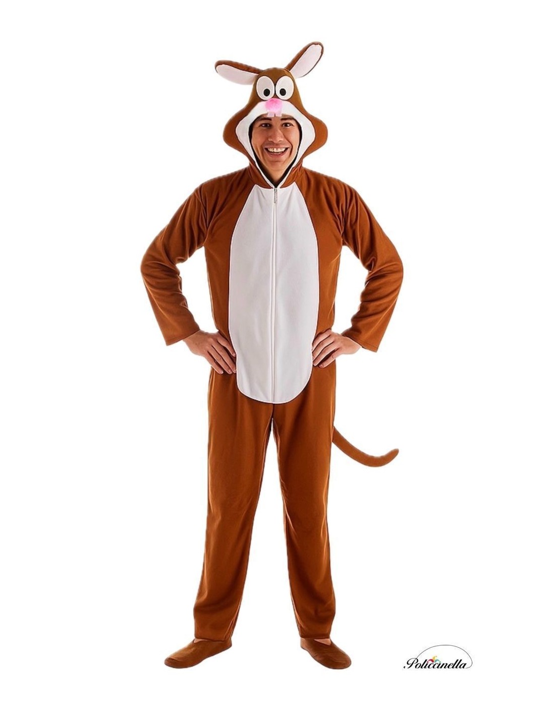 Costume de lapin mignon et amusant, avec une combinaison intégrale en polyester au toucher velouté et une fermeture éclair invisible sur le devant. La capuche intégrée, rembourrée pour maintenir sa forme, présente des yeux et des dents en feutre dense, des oreilles rembourrées pour rester droites et un nez doux et moelleux attaché au tissu. À l'arrière, une coquette petite boule en fausse fourrure imite la caractéristique queue de lapin. Léger, confortable et plein de charme.